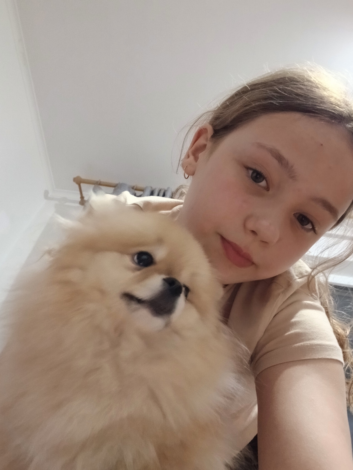 A young girl with light brown hair and fair skin takes a selfie with a small, fluffy, light brown dog. The girl has light eyes, a small nose, and pink lips. She is wearing a beige top. The dog is posi…read more