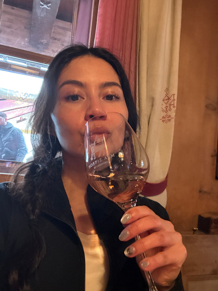 A female subject is depicted indoors, looking directly at the camera, with her lips touching the rim of a wine glass. She has dark hair and is wearing a dark zip-up jacket over a light-colored top. He…read more