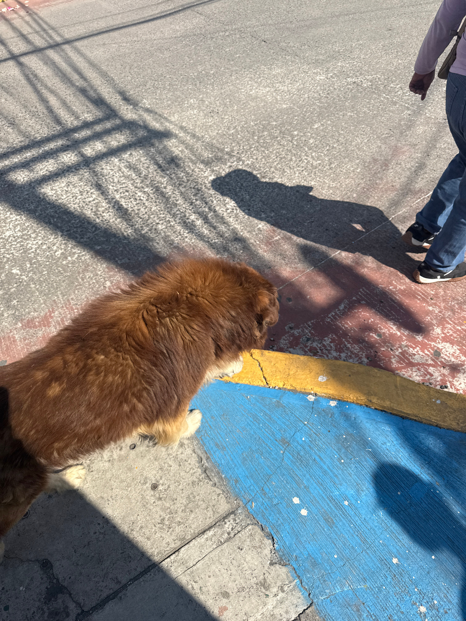 The scene, likely captured on a sunny day in Heroica Puebla de Zaragoza, Mexico, depicts a close-up, overhead view of a street corner. A brown, long-haired dog is lying on the pavement, with its body…read more