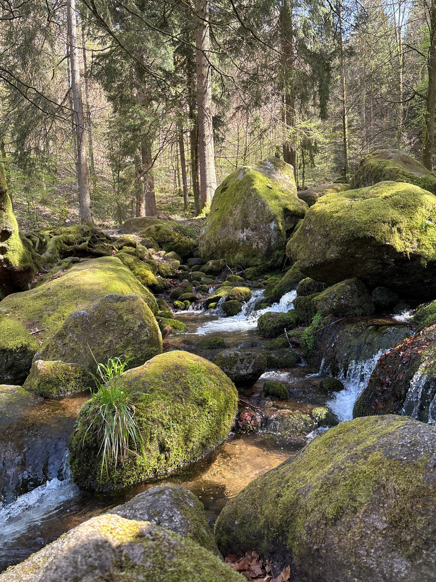 The image shows a section of a stream flowing through a moss-covered rock formation in a forest. The stream is located in Bühlertal, Germany. The rocks are primarily covered with green moss and are of…read more