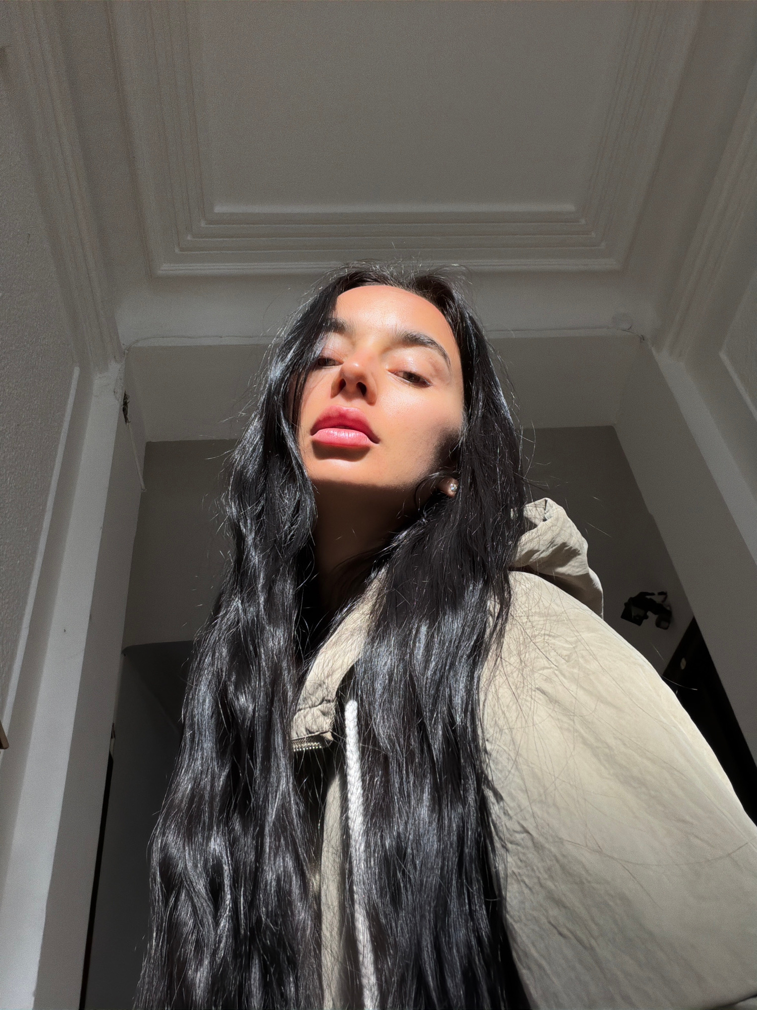 A medium shot depicts a young woman with dark hair lying on a light-colored bed. The background consists of a white wall with decorative molding on the left and a doorway leading to a dimly lit room i…read more