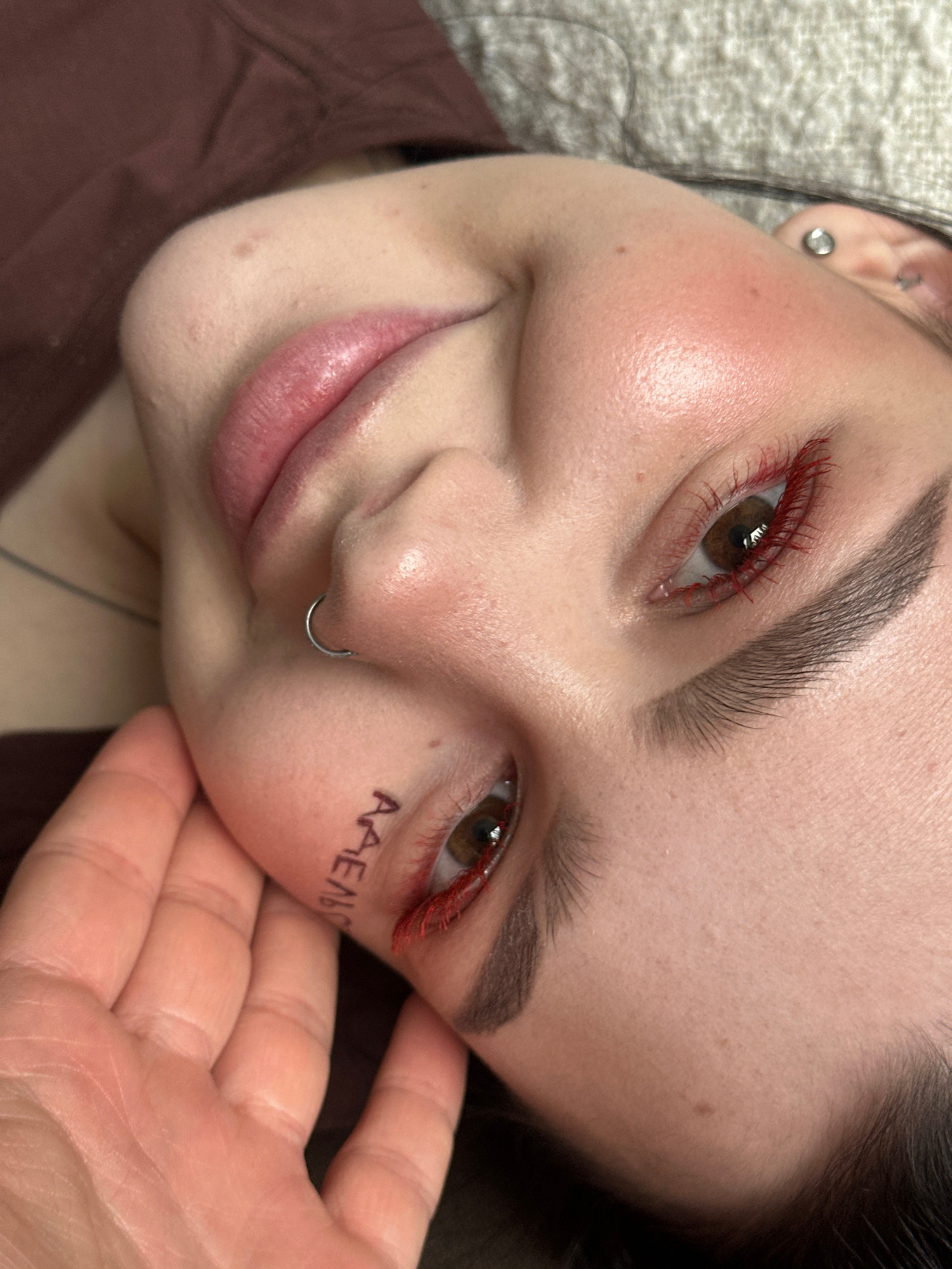 A close-up shot features a person's face. The person has fair skin, dark eyebrows, and brown eyes with red mascara. A nose ring is visible. There is writing on the cheek. The person's hand is also vis…read more