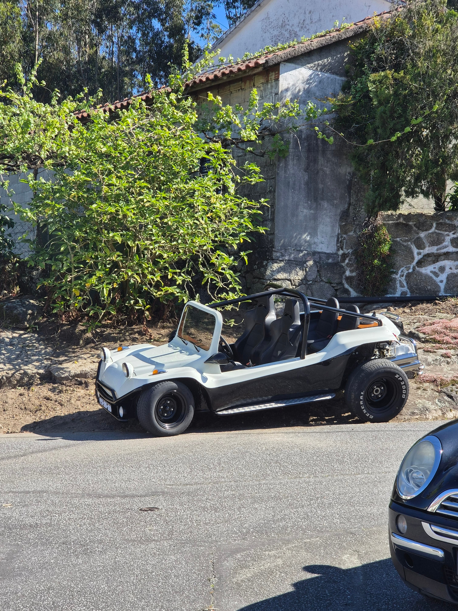 A white buggy-style vehicle with black roll bars is parked on the right side of a paved road, next to a grassy verge. Part of a black car is visible on the right side of the frame. To the left of the…read more
