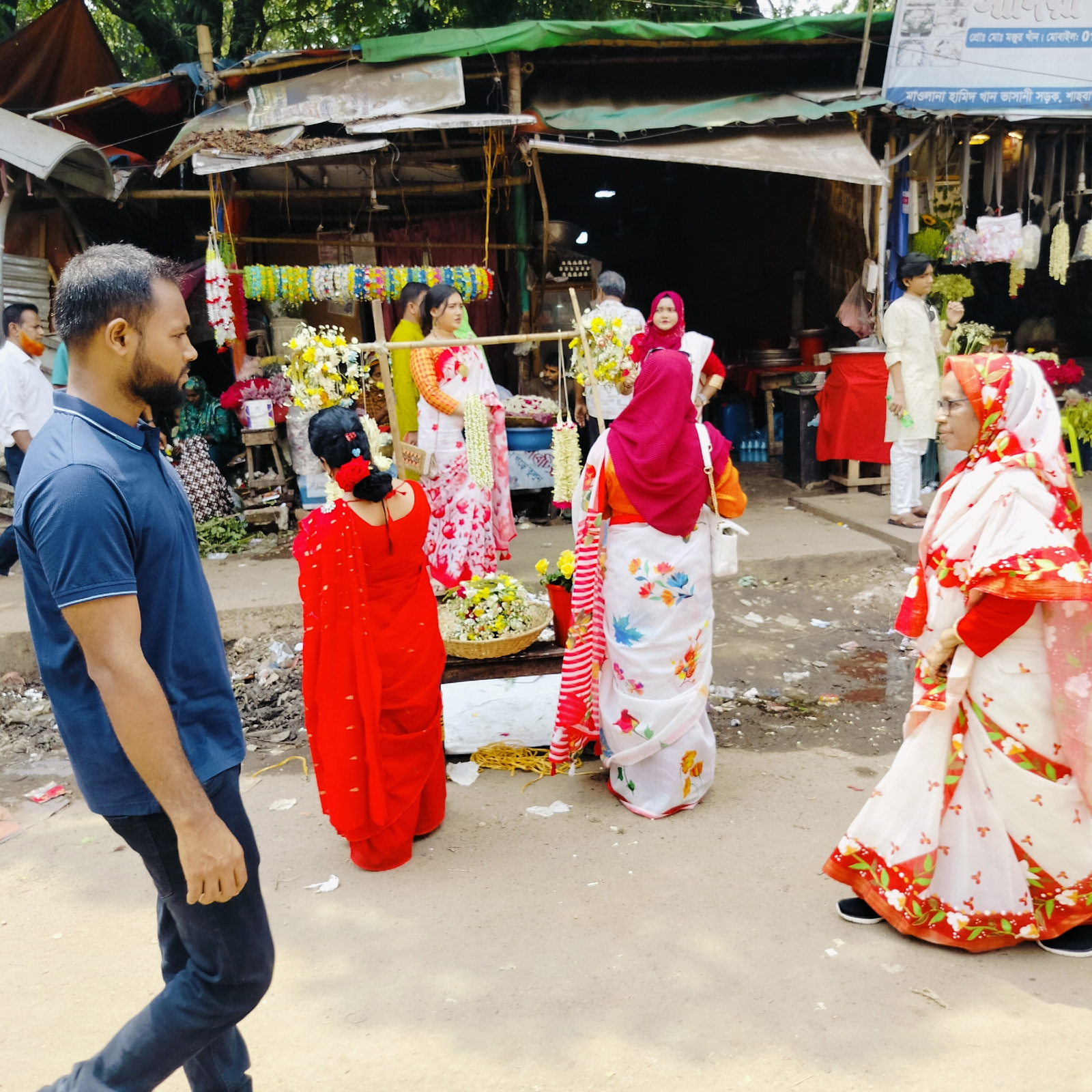 This medium shot photograph captures a bustling street scene in Dhaka, Bangladesh, identified by the sign "মাওলানা হামিদ খান ভাসানী সড়ক, শাহবা" indicating the road Maulana Hamid Khan Bhasani Road in S…read more