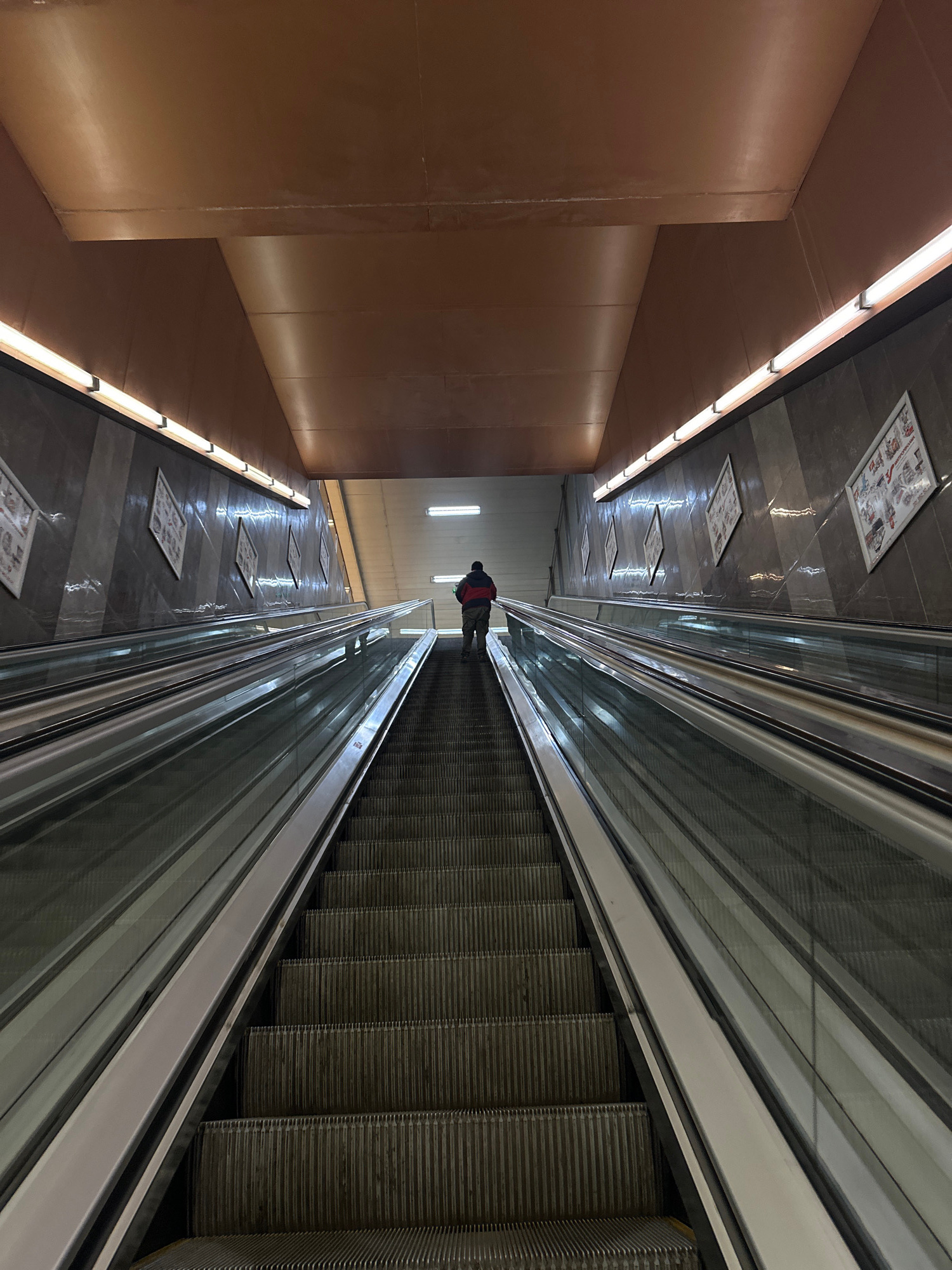 An indoor, vertically oriented long-exposure image depicts a subterranean passage, likely a metro station in Sofia, Bulgaria. The composition is dominated by a long escalator on the right side, which…read more