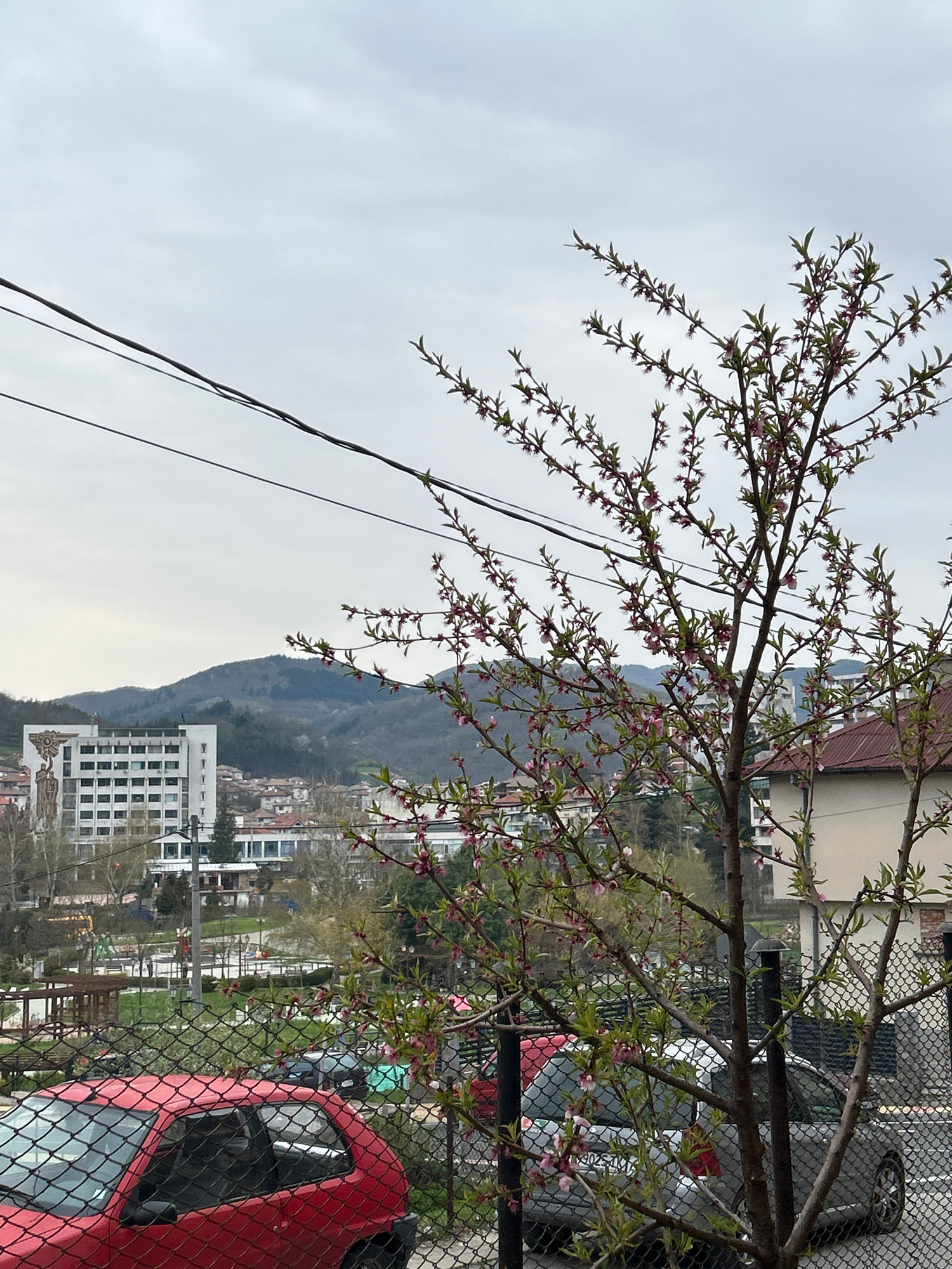 The image depicts a cityscape with a mountain range in the background, partially obscured by flowering tree branches in the foreground. In the middle ground, there is a tall, white building, typical o…read more