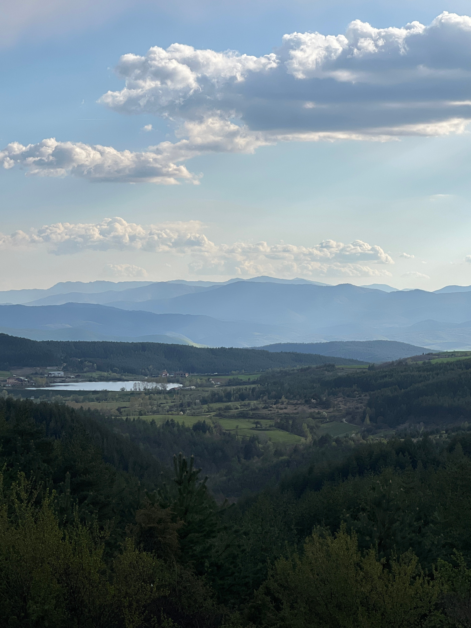 The image depicts a landscape with layered mountains fading into the horizon. Cumulus clouds are present in the sky. A body of water, likely a river or lake, winds through a valley surrounded by denseβ¦read more