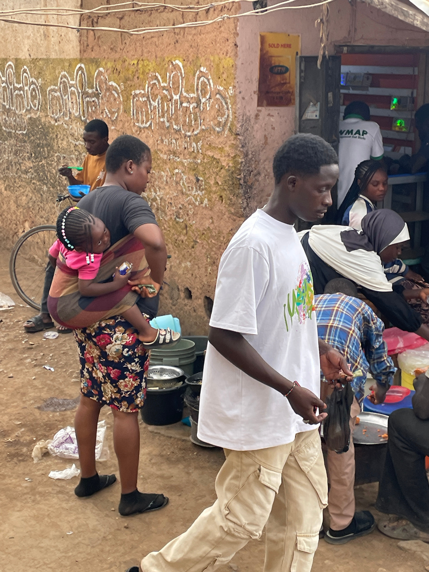 The image depicts a scene in Jos, Nigeria. A group of people are congregated outdoors. A man in a white t-shirt and khaki pants stands prominently in the foreground. Several other people are seated or…read more