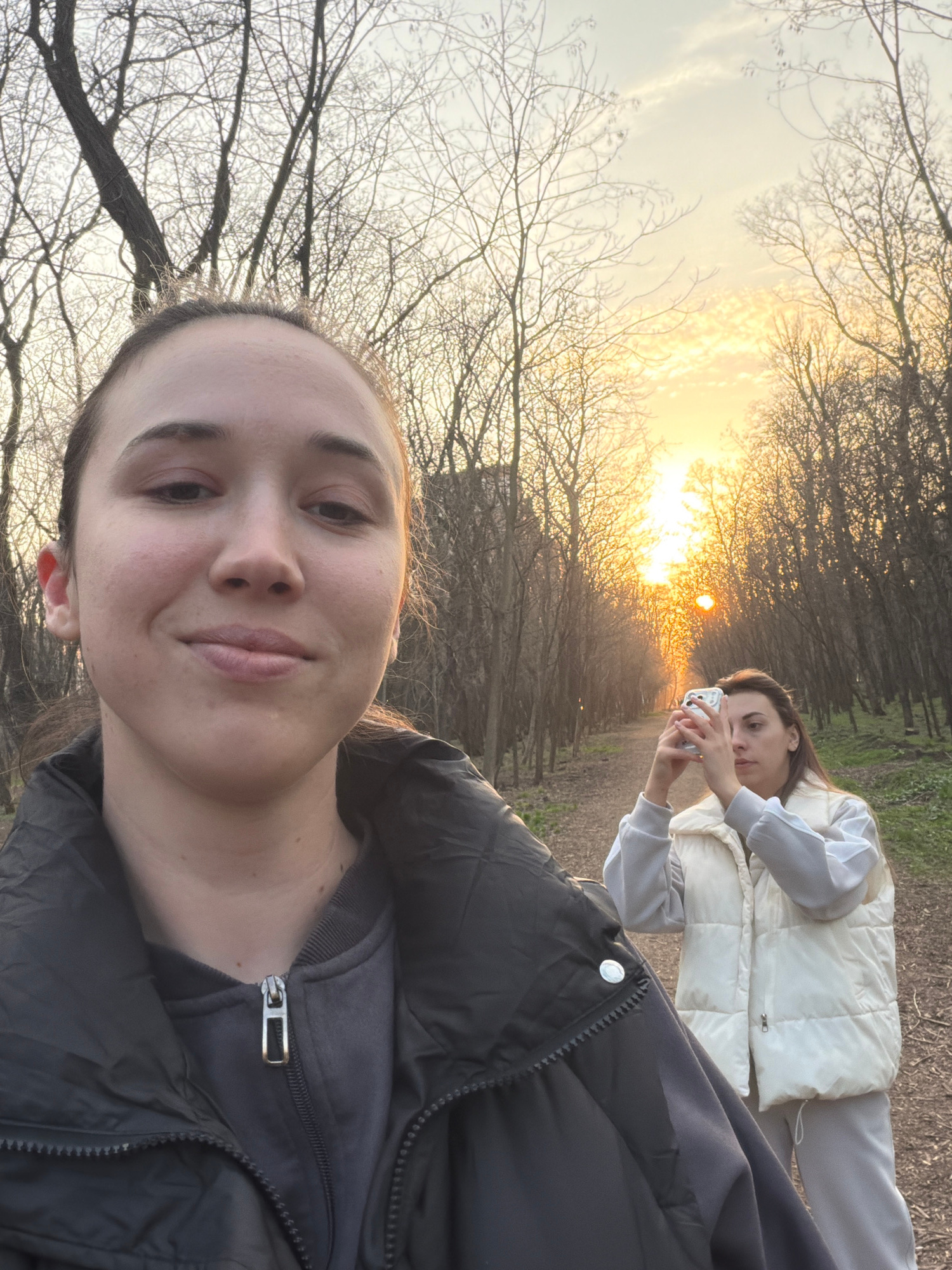 The image depicts an outdoor scene at sunset within a tree-lined avenue, likely a park, specifically identified as Ostrovsky Park (Парк культуры и отдыха имени Н. Островского) in Rostov-on-Don, Russia…read more