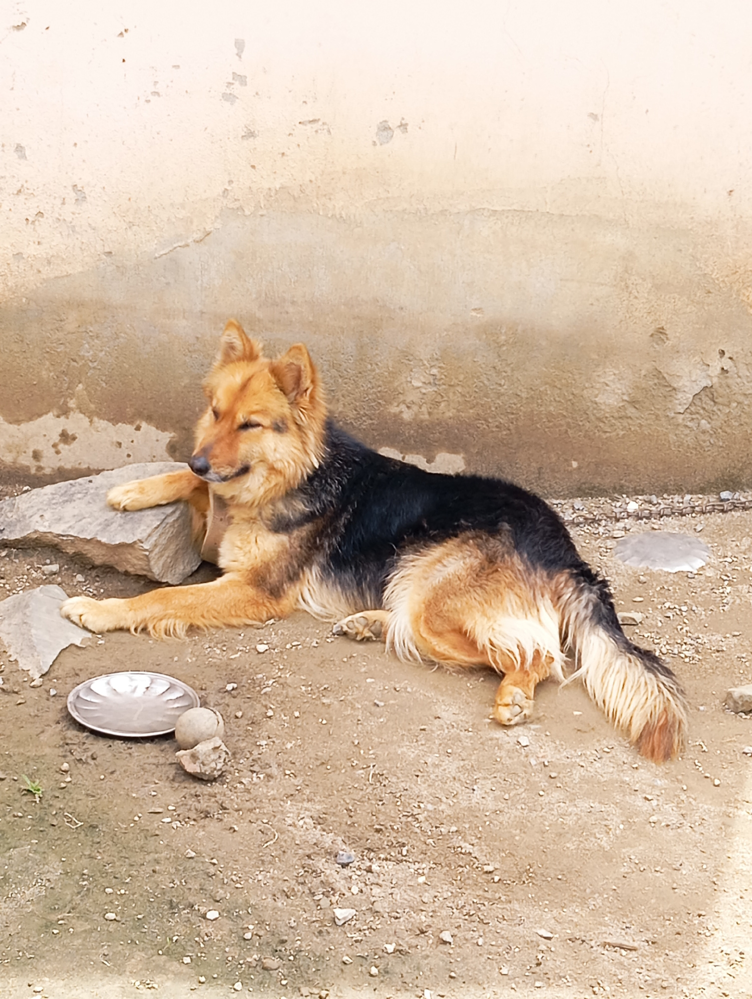A medium-sized, long-haired dog, primarily tan and black, lies on light brown dirt ground in what appears to be an outdoor area of Lassan, Pakistan. The dog rests its head on a rough, grey stone. A sh…read more