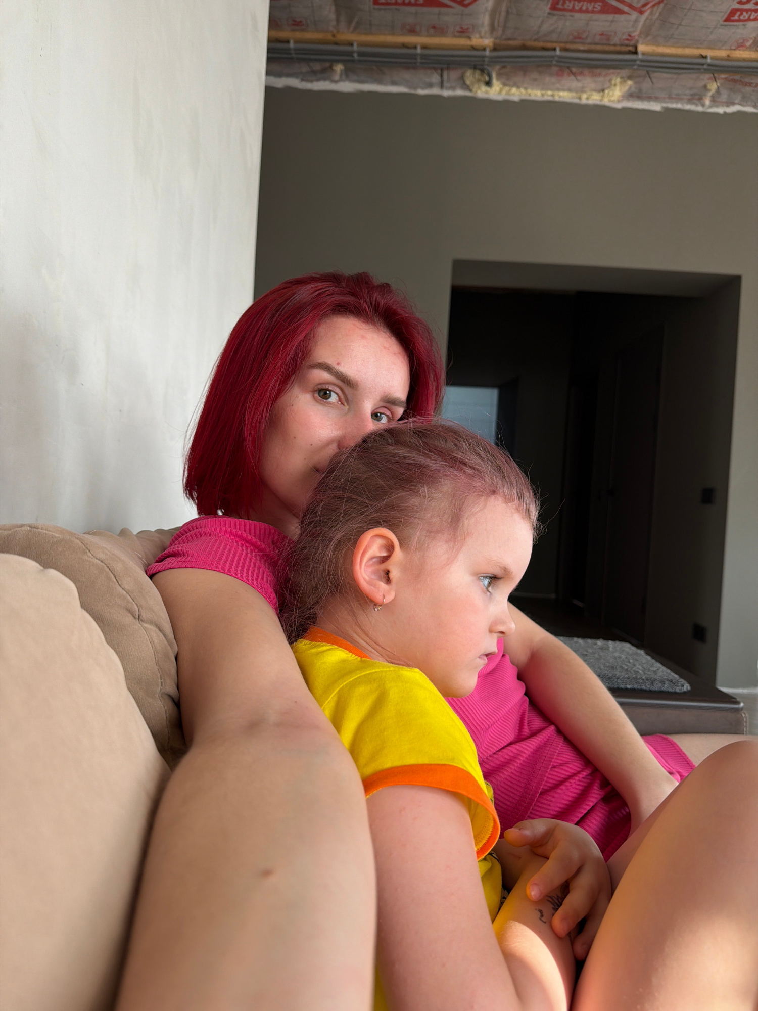 The image depicts a woman with bright red hair lying on a beige sofa next to a young girl. The girl is wearing a yellow t-shirt with orange trim and is looking upwards. The woman is looking directly a…read more