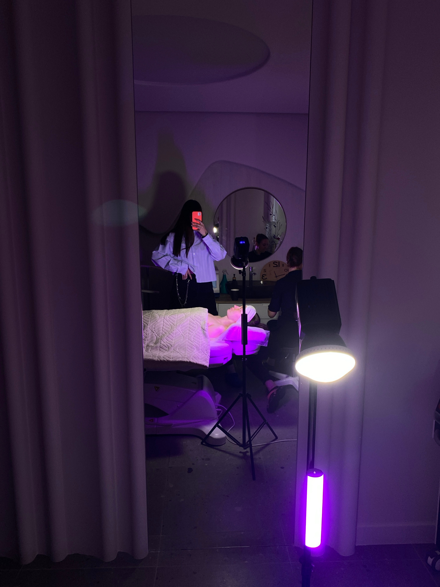 The image shows a mirrored view of a room with studio lighting setup. Reflected in the mirror is a person holding a mobile phone, wearing a light blue collared shirt. To the right of this figure is a…read more