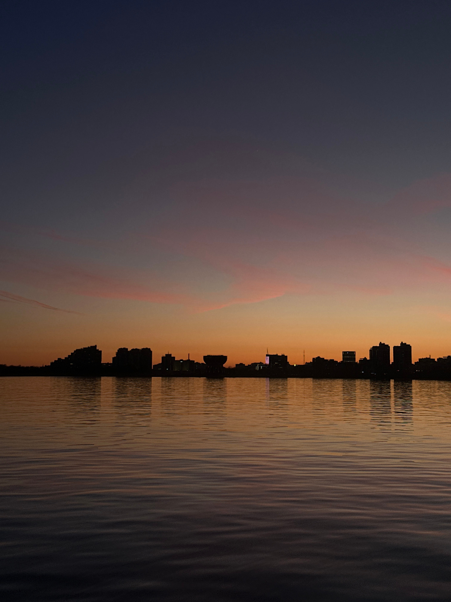 The image captures a serene twilight scene of a city skyline across a body of water, likely in Kazan, Russia. The sky dominates the upper part of the frame, transitioning from a deep, dark blue-purpleβ¦read more