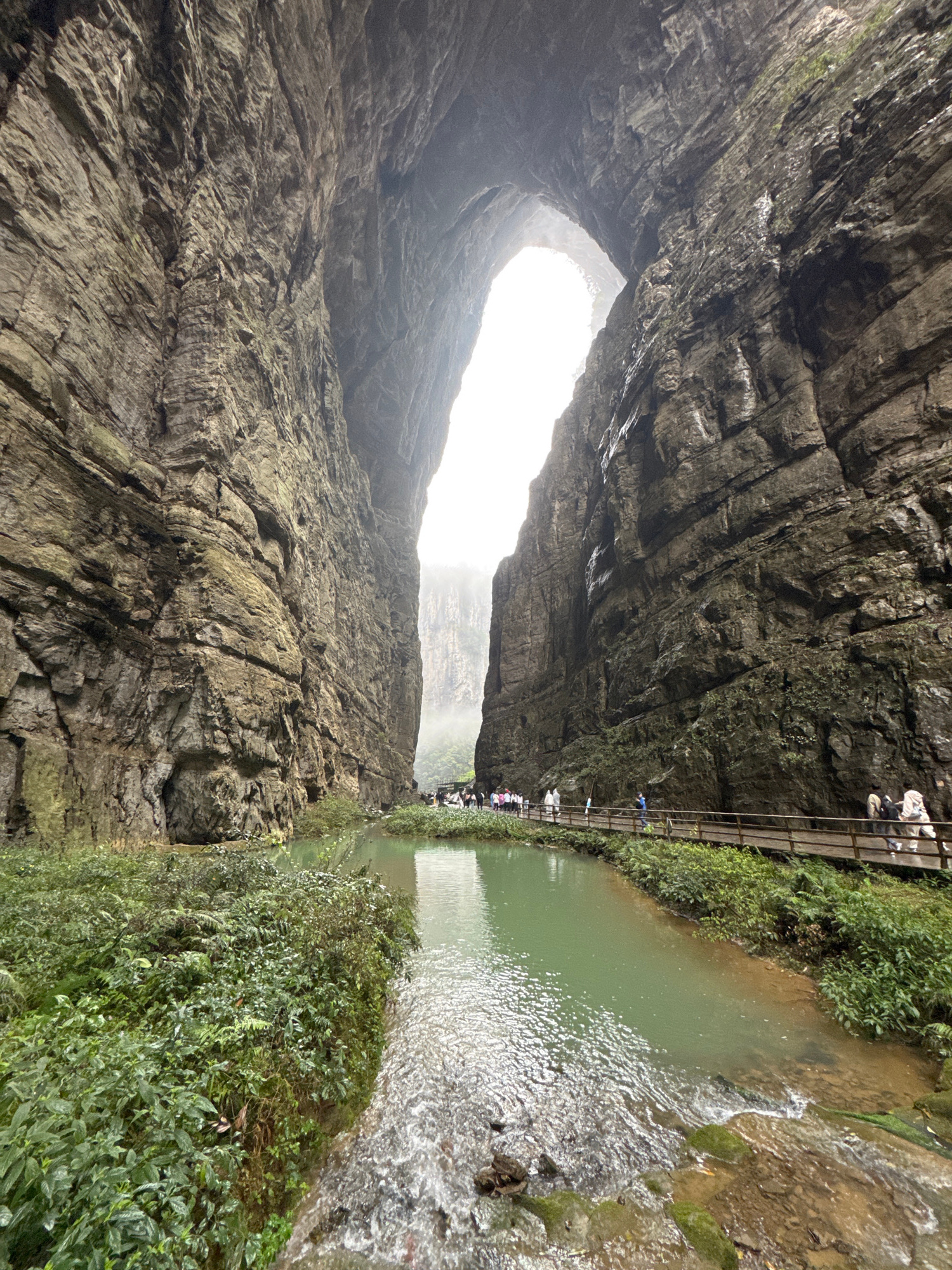 The image captures a deep, cavernous gorge in Wulong District, Chongqing, China. Two towering rock walls, heavily textured and damp, converge towards a bright opening at the top. A narrow river flows…read more