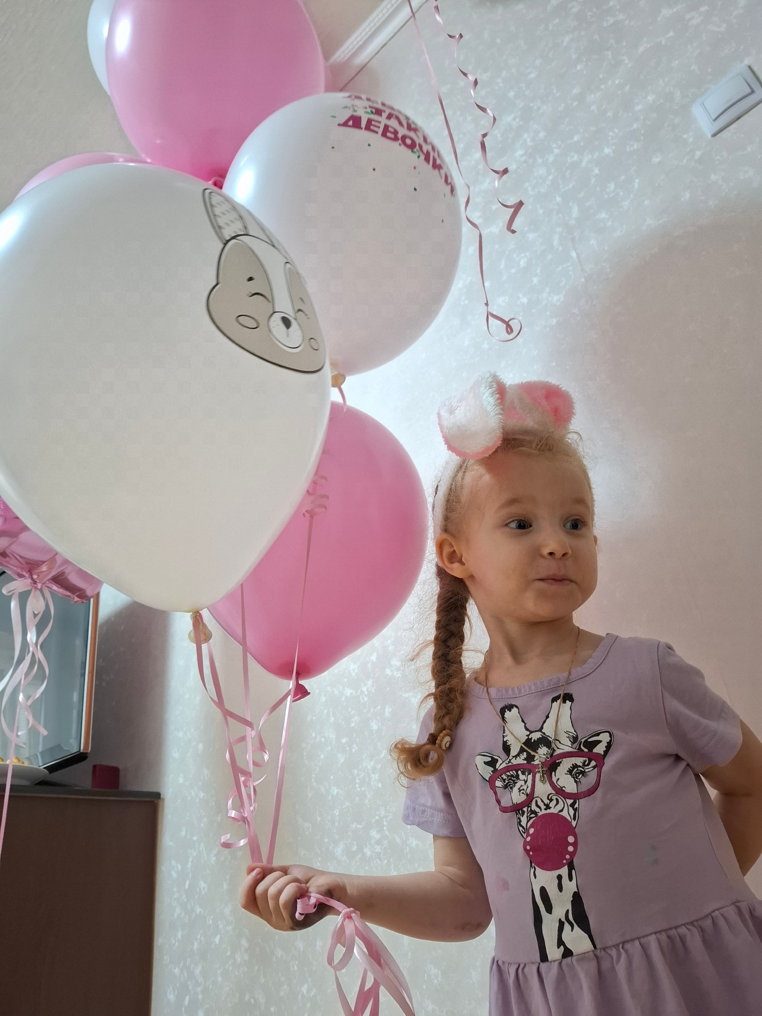 A fair-skinned young girl with blonde hair, wearing a lavender t-shirt with a giraffe wearing glasses, stands in front of a white ceiling with a light fixture, holding a bunch of pink and white balloo…read more