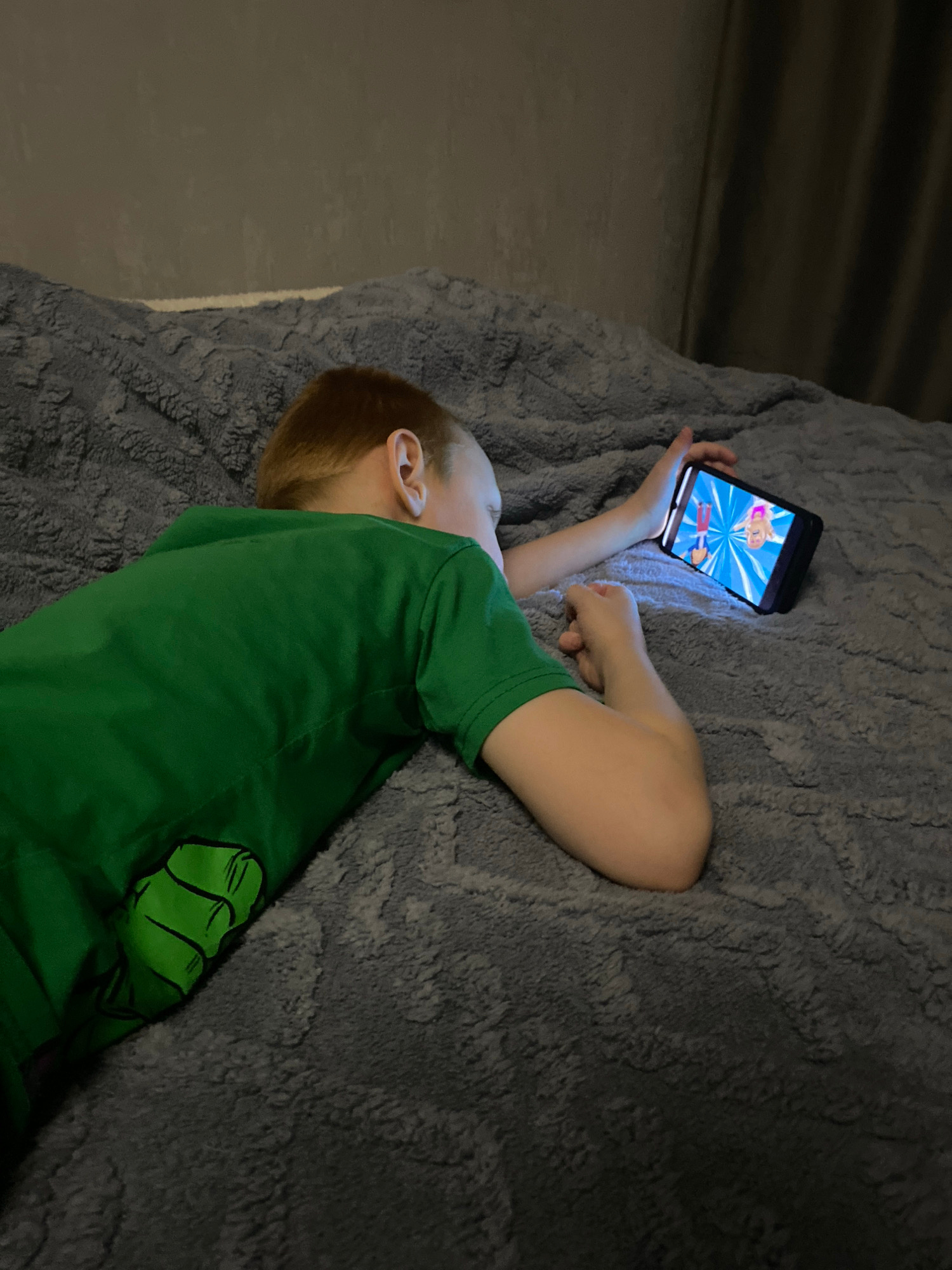 A young, light-skinned boy with red hair is lying on his stomach on a grey, textured blanket. He is wearing a green t-shirt with a cartoon graphic on the back. He is holding a black smartphone in hisβ¦read more