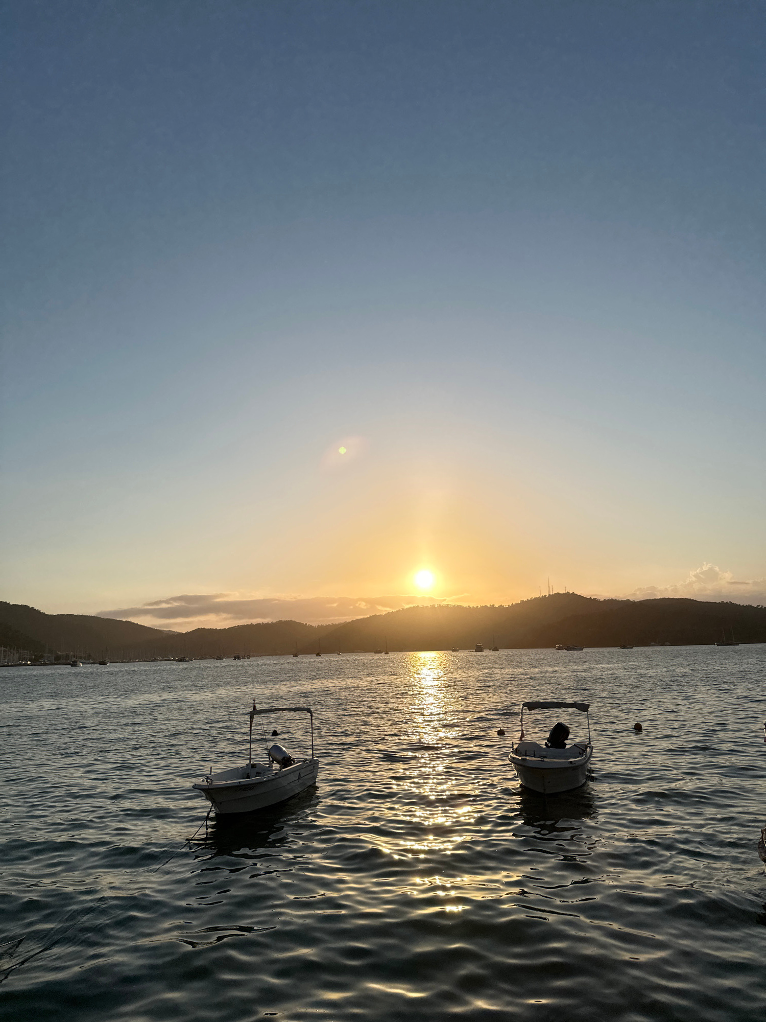 The image depicts a sunset over the water, likely in the coastal city of Fethiye, Turkey, based on the geographical features of the land across the water. The sun is positioned near the horizon, casti…read more