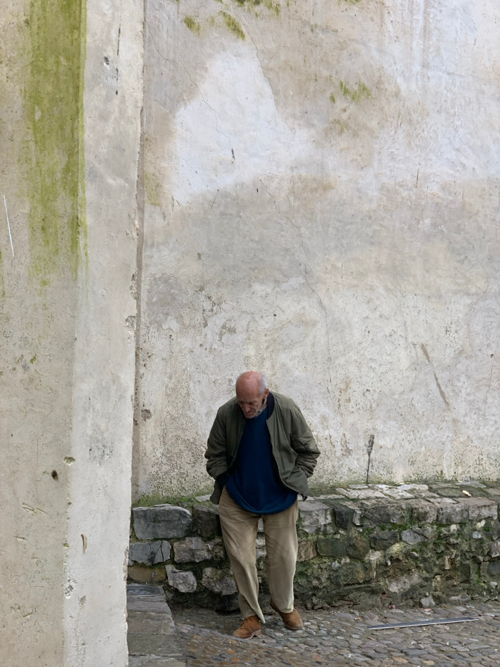 A single adult male, appearing elderly and bald, stands in an alleyway in Tangier, Morocco. He is positioned with his head bowed and gaze directed downwards, hands inserted into the pockets of his darβ¦read more