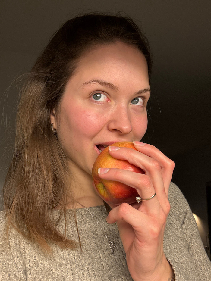A light-skinned adult female is depicted in a close-up, chest-up portrait, holding a red and yellow apple to her mouth as if about to bite it. She has long, light brown hair, blue eyes, and her gaze iā¦read more
