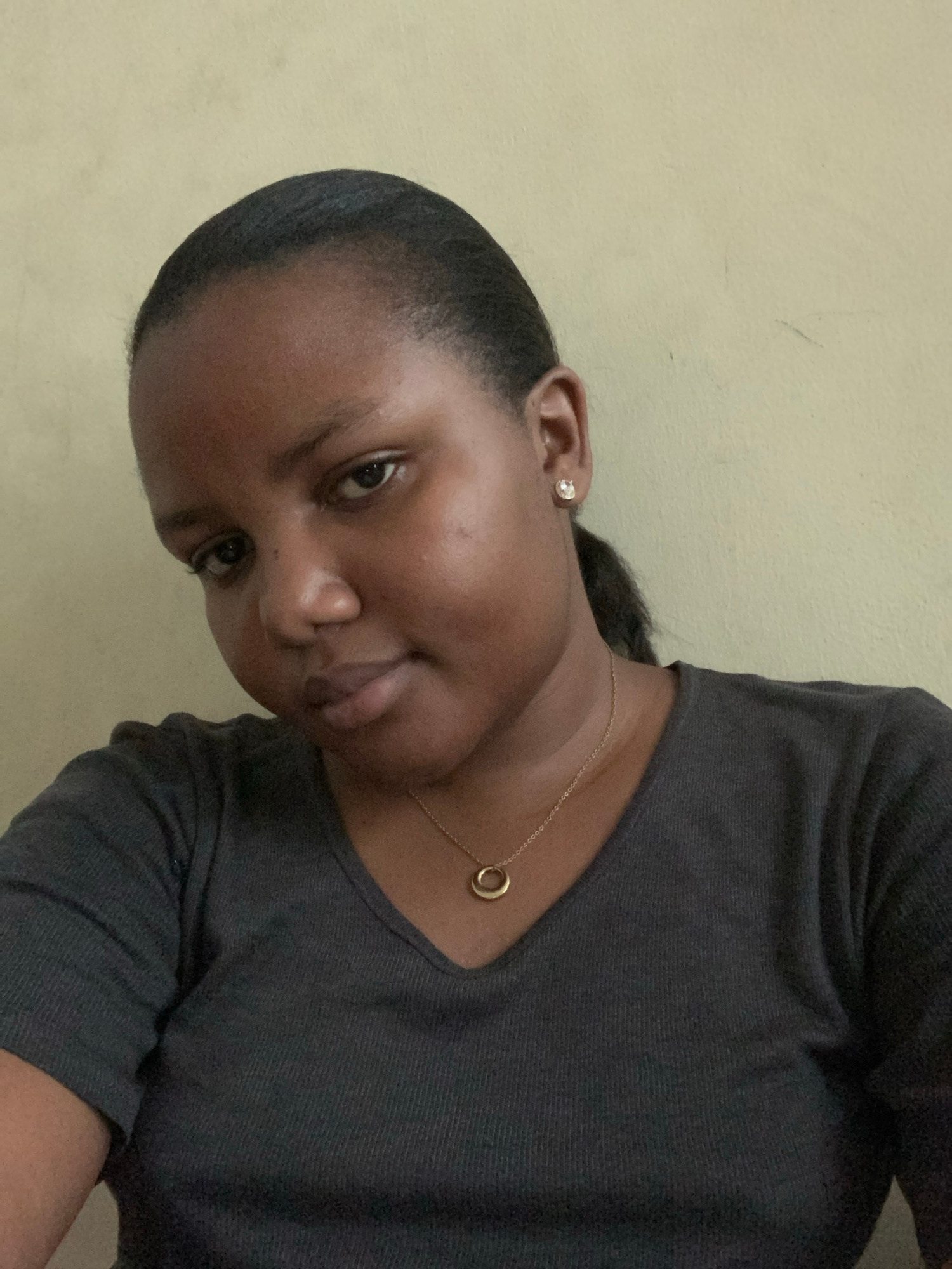 A close-up portrait captures a young woman positioned against a plain, light beige or pale yellow wall. Her head is tilted, and she looks directly at the camera with a calm, subtle expression, her ton…read more