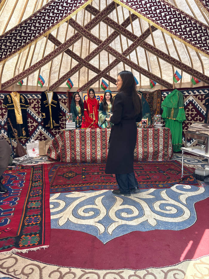 The scene is set inside a traditional yurt in Astana, Kazakhstan, configured for a cultural exhibition or event. The yurt's interior structure, including its wooden lattice framework and radial roof p…read more