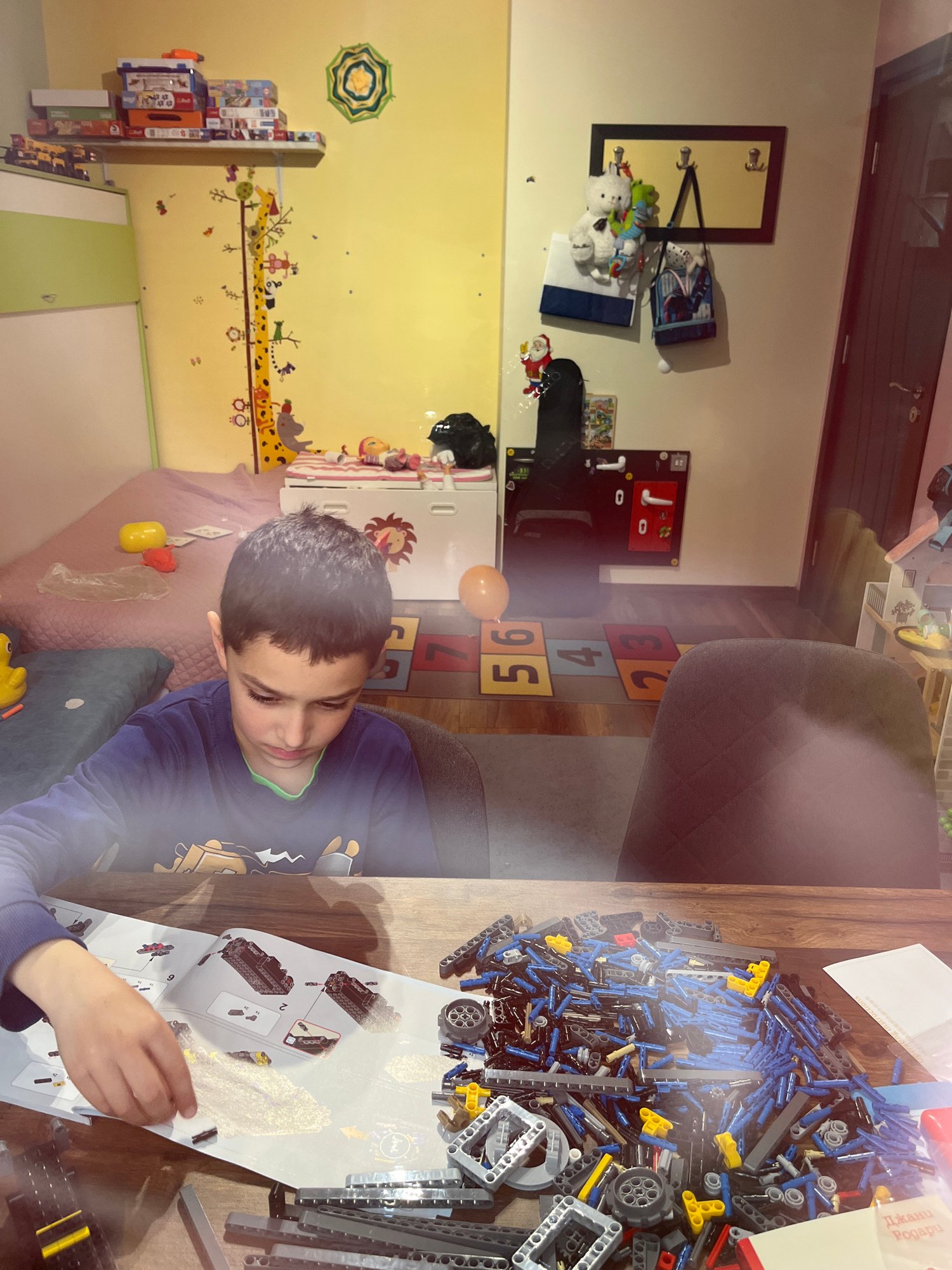 A boy sits at a wooden table in an interior setting, assembling a Lego Technic set according to the instructions. The table is covered with Lego pieces. The room is decorated with children's wallpaper…read more