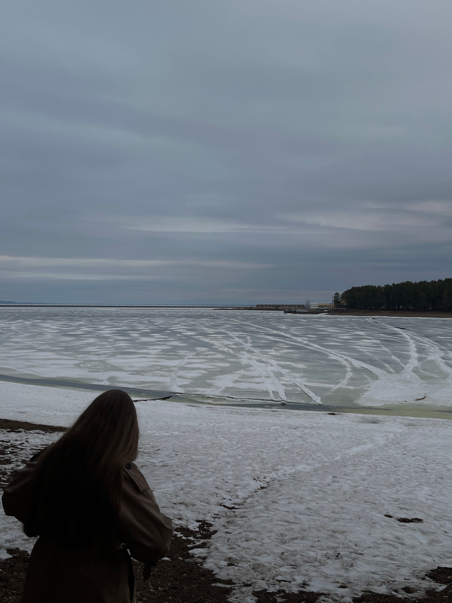 The image depicts a landscape featuring a body of water covered in ice with prominent tire tracks crisscrossing its surface. A line of trees is visible in the distance, presumably on the opposite shor…read more