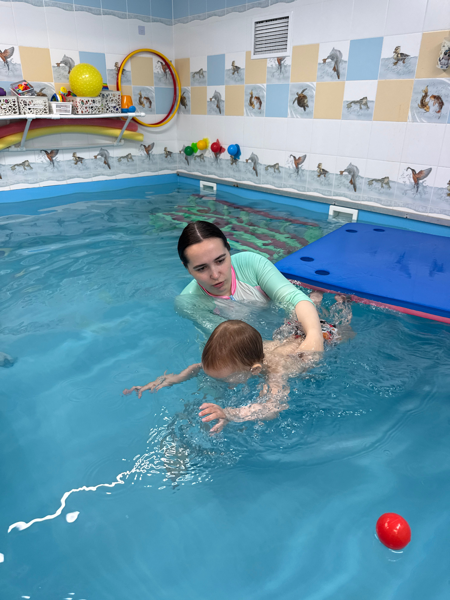 The image shows a woman in a light blue and white rash guard swimming with a young child in a pool. The woman appears to be supporting the child in the water. A red ball floats on the surface of the w…read more