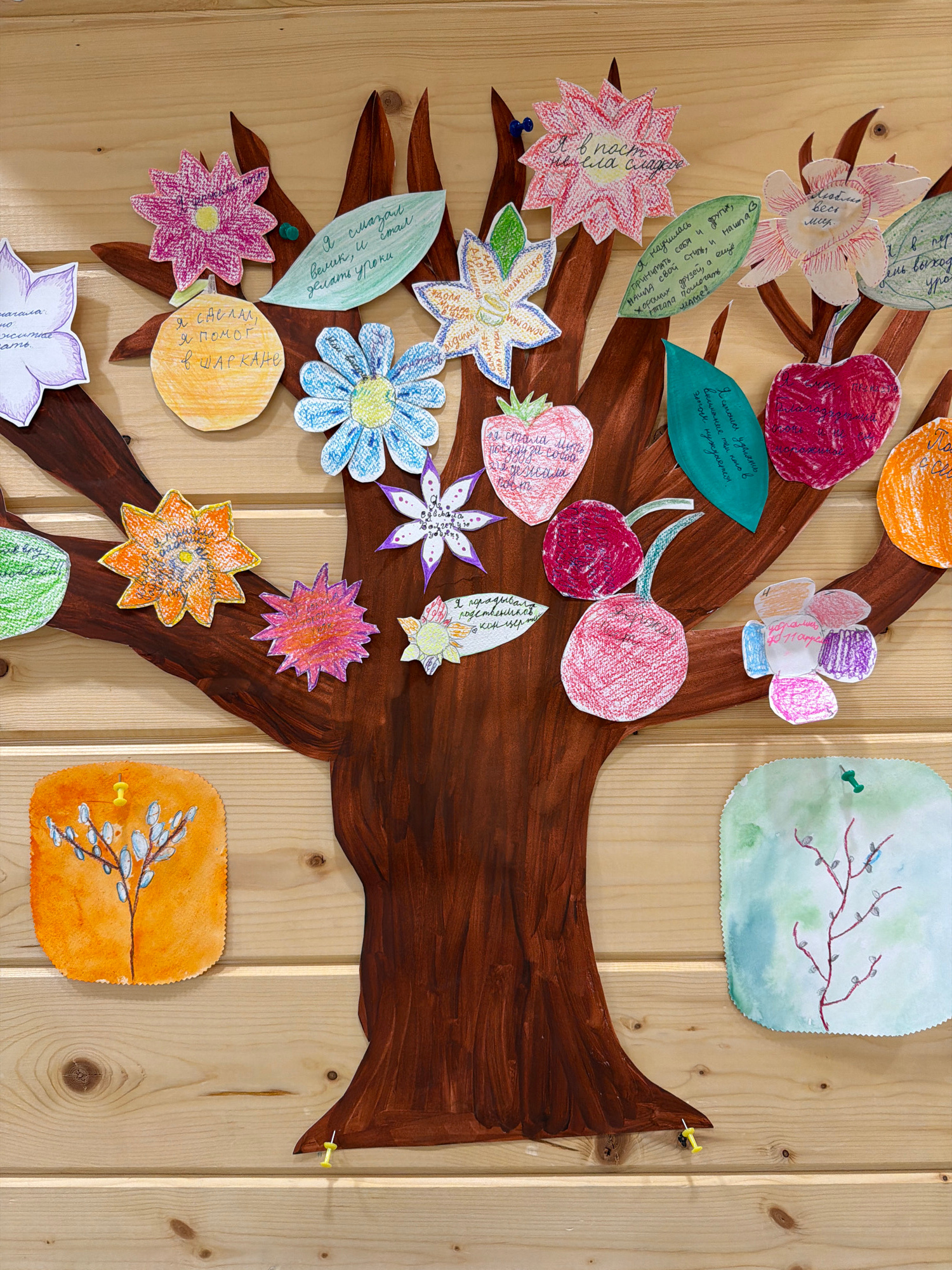 The image shows a bulletin board made of light-colored wooden planks. Affixed to the board is a hand-painted, brown tree with various paper cutouts attached to its branches. These cutouts include flow…read more