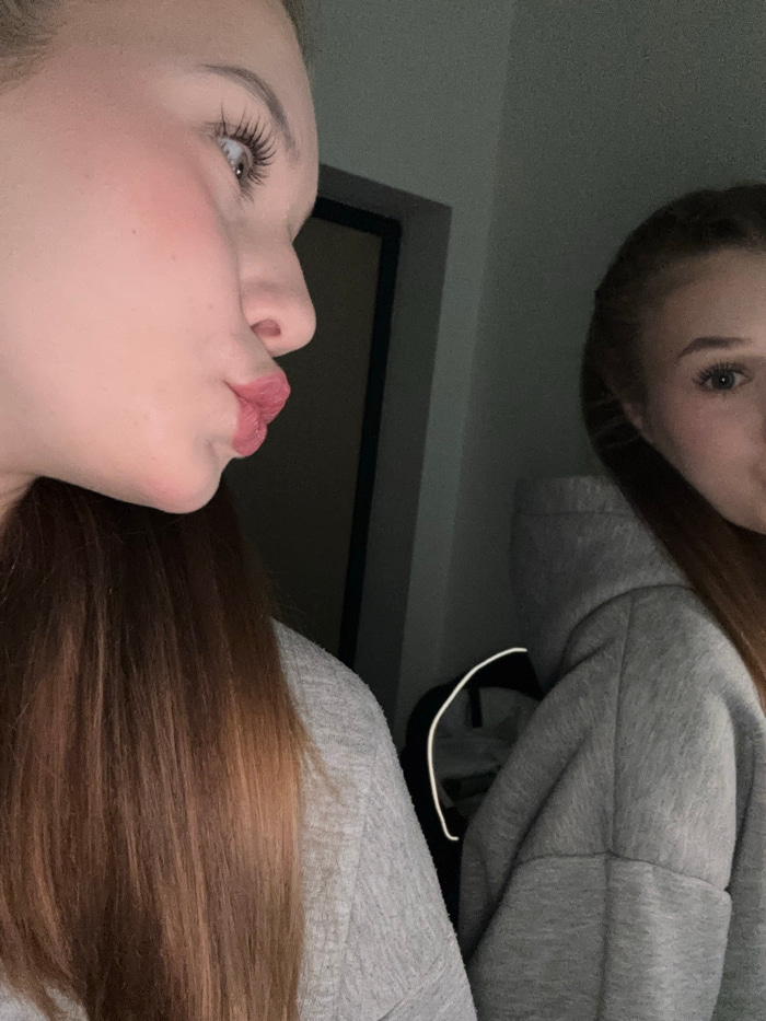 Two women are captured in this selfie-style image. The woman in the foreground faces upwards with pursed lips. She has fair skin, long eyelashes, and auburn hair. Above her, the second woman, wearing…read more