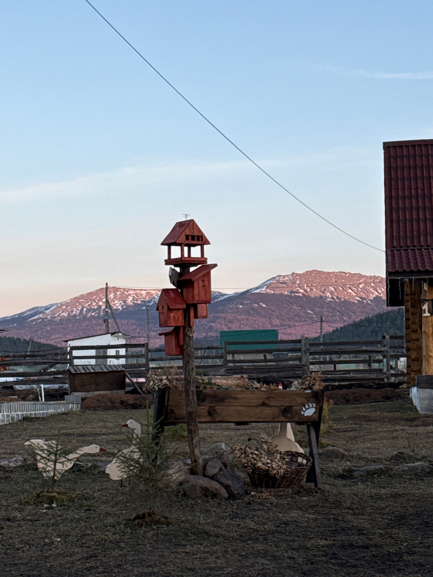 The image captures a scene in Tyulyuk, Russia, featuring a wooden multi-tiered birdhouse prominently placed in the foreground. The birdhouse stands against a backdrop of a mountain range with snow-cap…read more