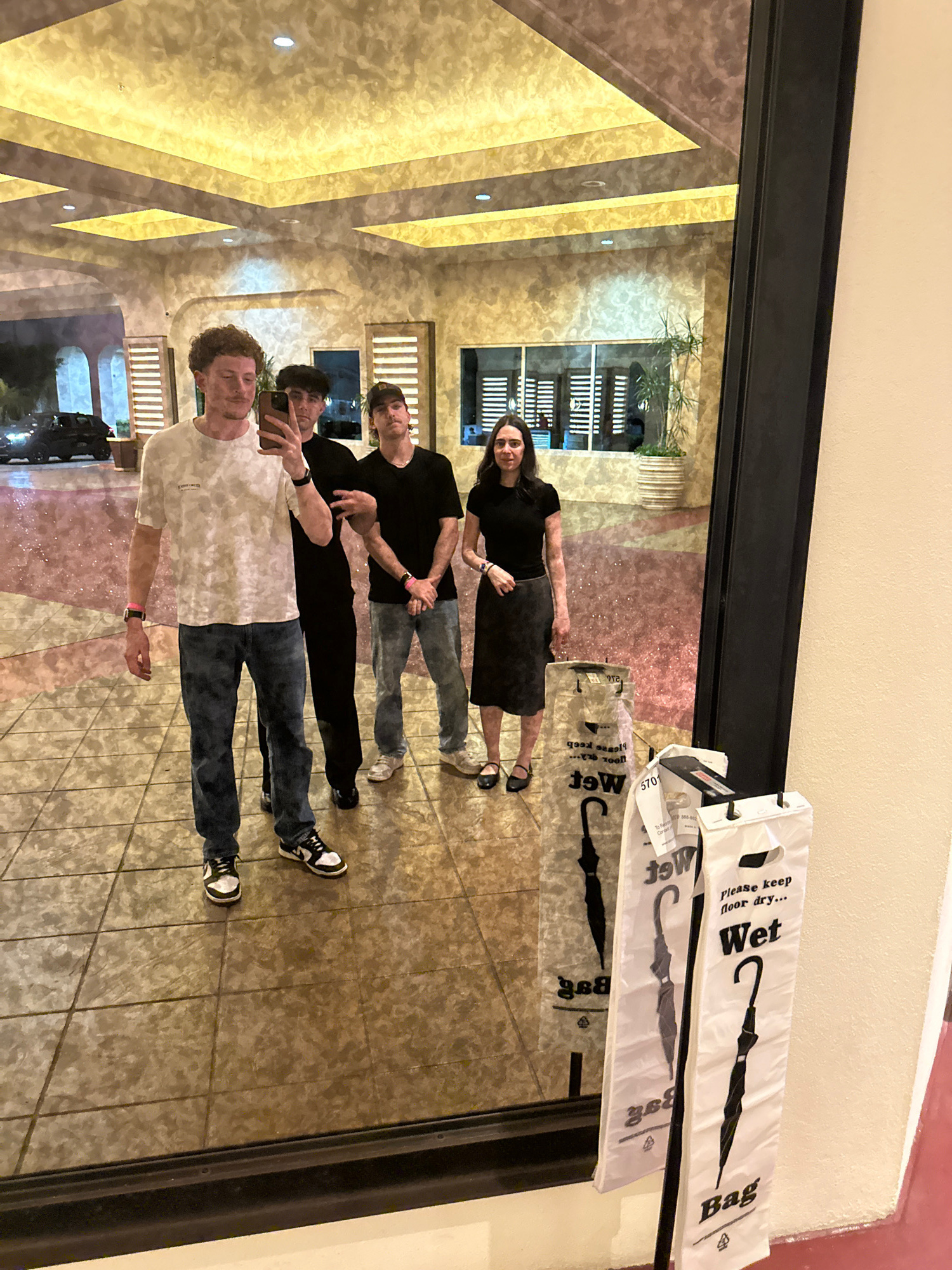 The photograph shows a group of four people standing near a mirrored wall. The mirror reflects their images, creating a doubled visual effect. Starting from the front, a man in a light-colored patternβ¦read more