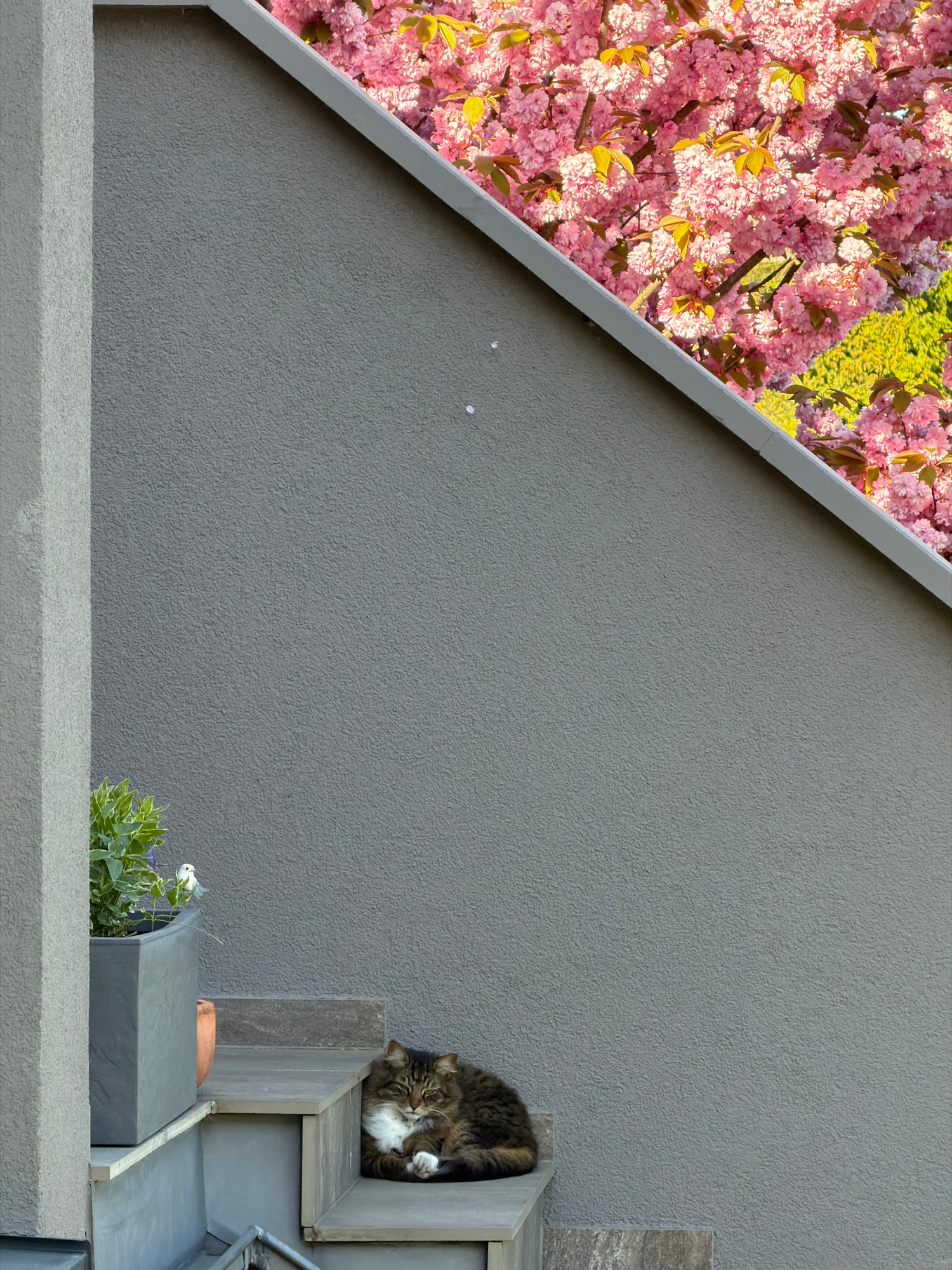 This image captures a tranquil outdoor scene in Esch-sur-Alzette, Luxembourg, featuring a blend of architecture and nature. The central and right portions of the frame are dominated by a textured, lig…read more