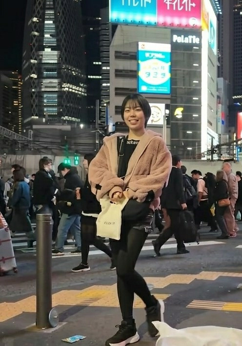 The image depicts a crowded nighttime street scene, centered on a young East Asian woman smiling directly at the camera. She stands in the foreground, wearing a light pink faux-fur hooded jacket overβ¦read more