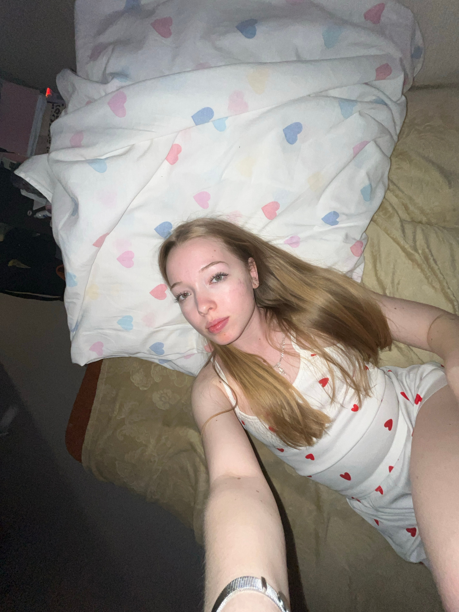 A young woman is lying on a bed in what appears to be a bedroom in Chaikovsky, Russia. She has long, light brown hair and fair skin, looking directly at the camera with a neutral expression. She is we…read more