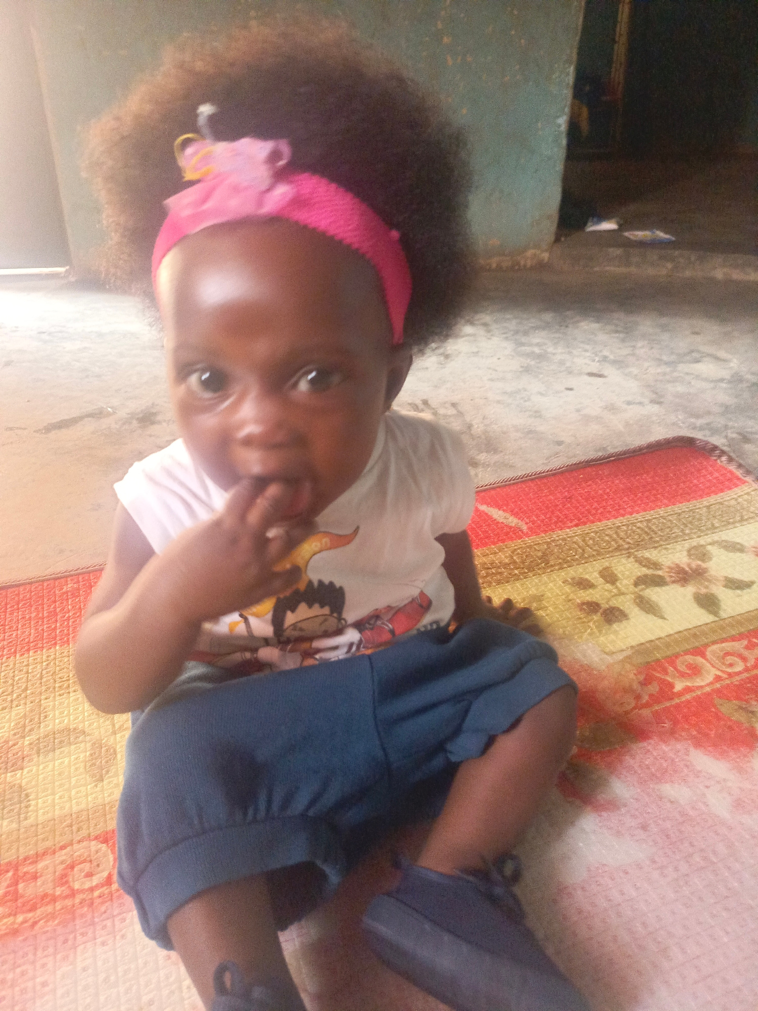 A young child is seated on a patterned mat. The child wears a white shirt with a cartoon image, blue shorts, and matching shoes. A pink headband adorns the child's hair. The child has fingers in their…read more