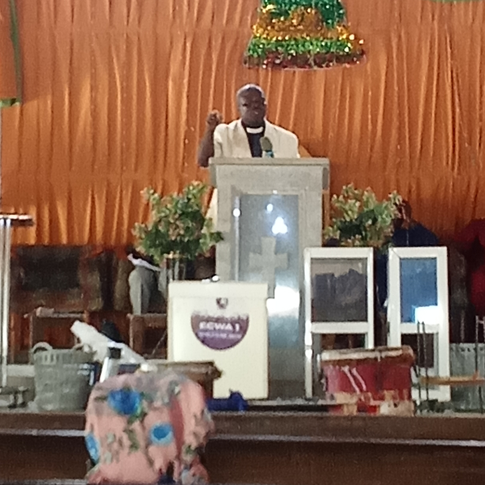 A man stands behind a podium, speaking, against a backdrop of orange drapes. A decorative green and gold item hangs above the podium. In front of the podium, there are various objects, including what…read more