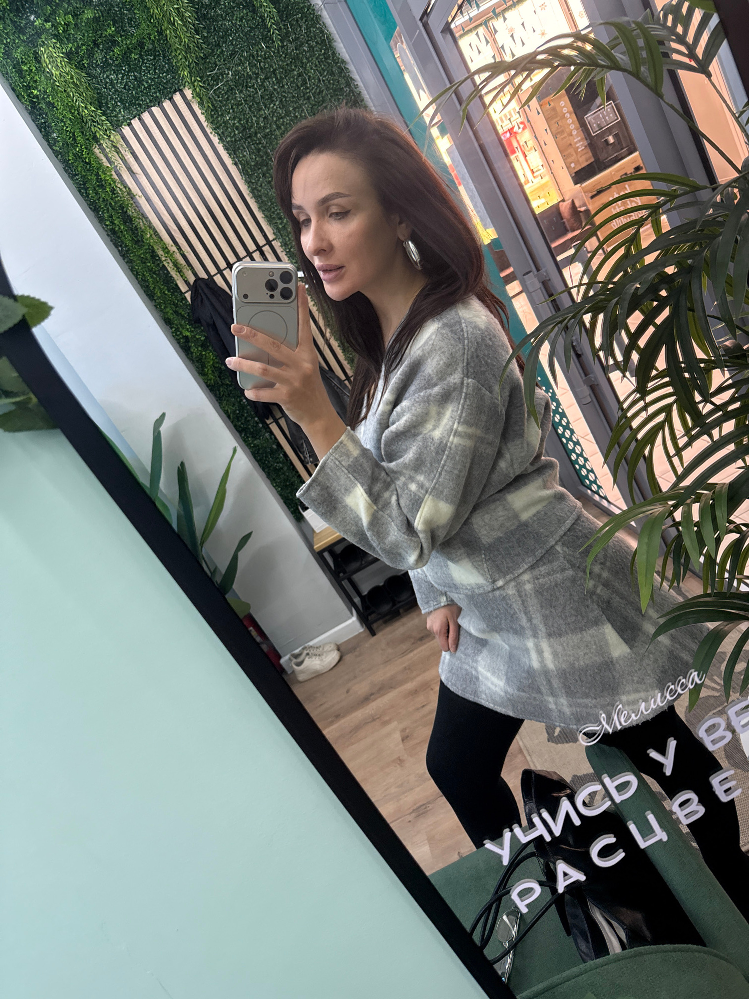 A woman is taking a selfie in a mirror. She is holding a white phone with a double lens camera. She is wearing a grey and white plaid jacket and black leggings. The mirror reflects a shop window and s…read more