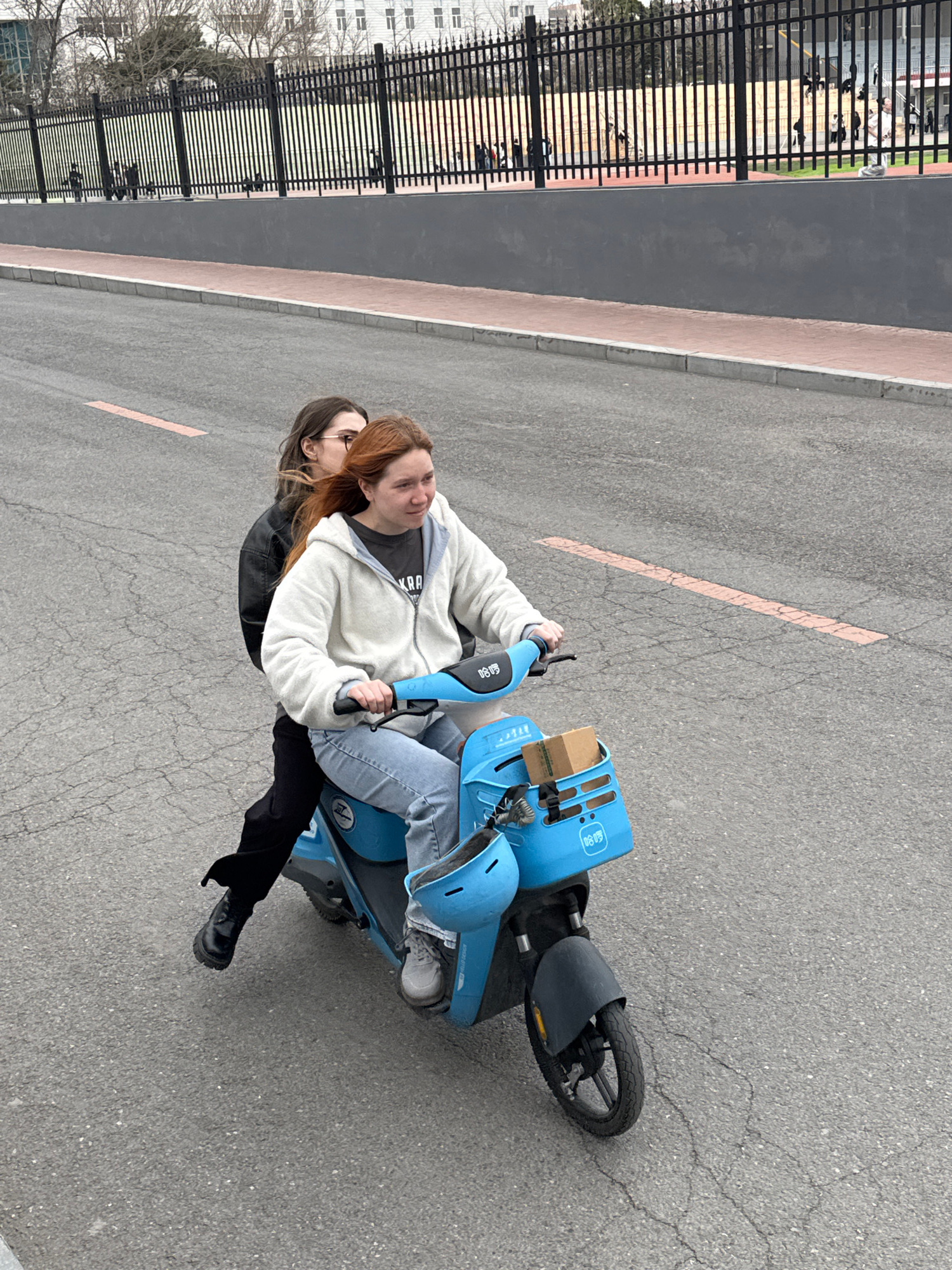 Two young women are riding a blue electric scooter on a paved road. The person in front is wearing a white hooded jacket and jeans and holding the handlebars. The person behind is wearing a black jack…read more