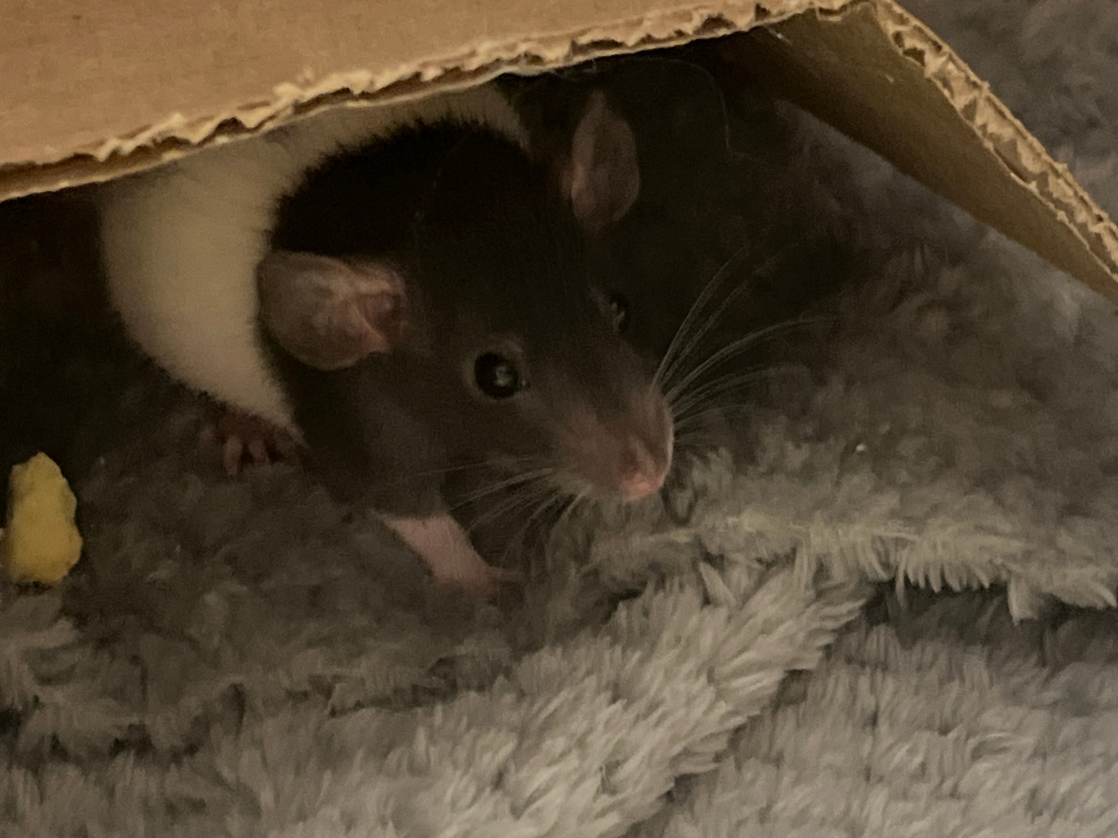A rat with a black and white coat is positioned under a cardboard box on a gray, plush, shag-like surface. The rat's head is brown, and its whiskers are visible. A small, yellow object is near the rat…read more