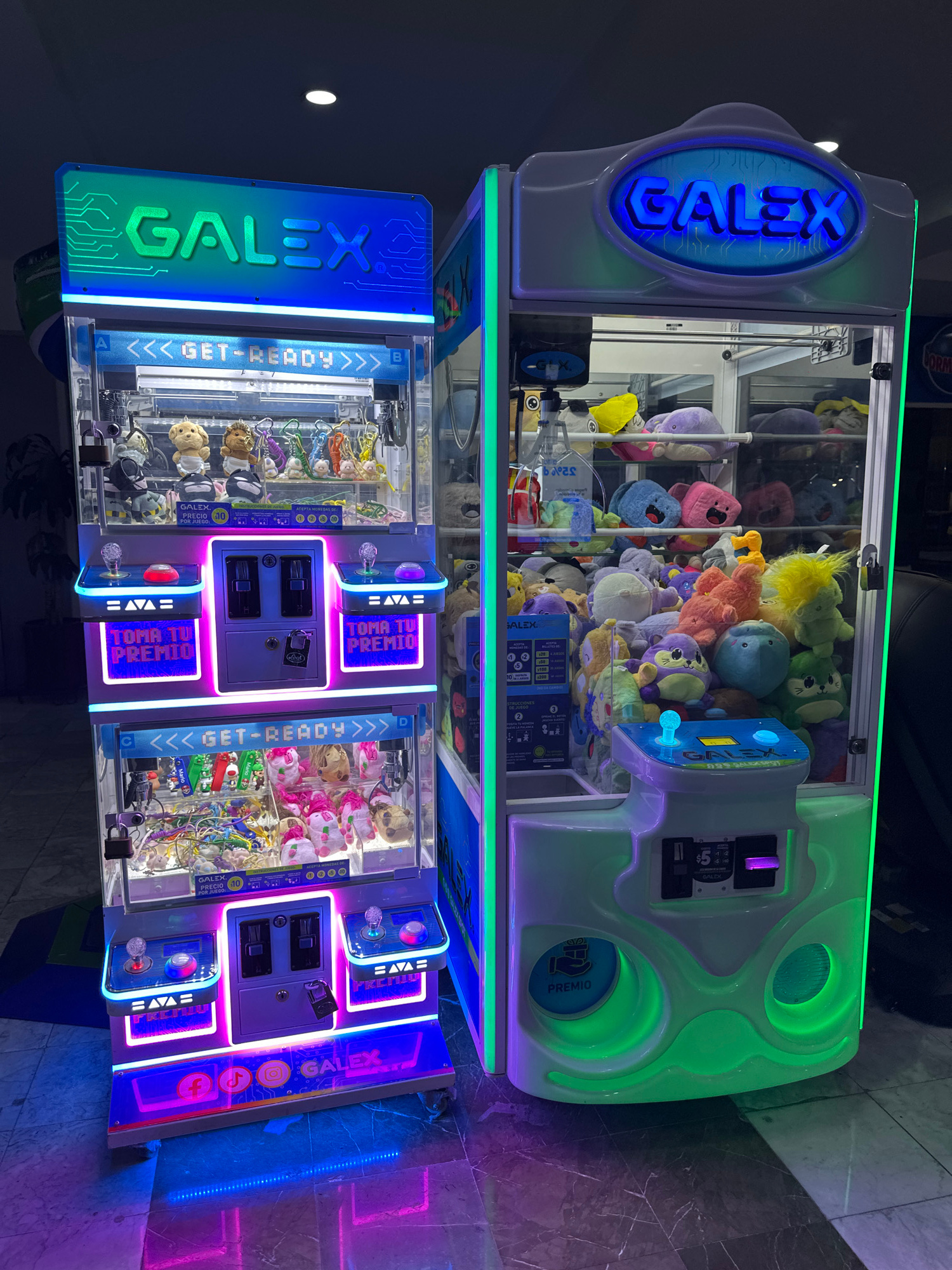 The image shows two Galex brand claw machines stacked on top of each other in what appears to be an indoor location in Huixquilucan de Degollado, Mexico. The top machine features a lime-green and whit…read more