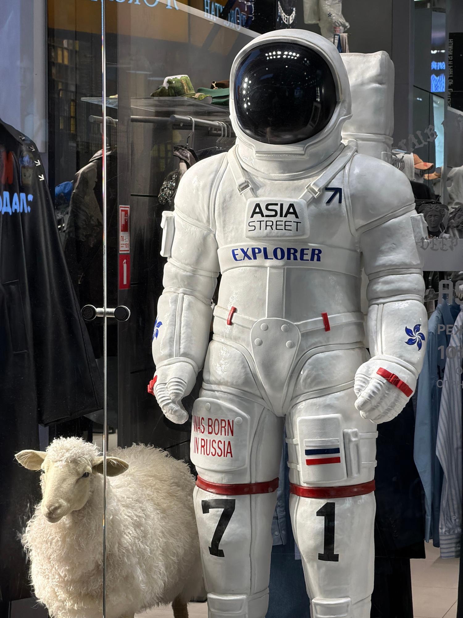 The image shows a storefront display in Saint Petersburg, Russia. The display features a white astronaut mannequin with the words "ASIA STREET EXPLORER" printed on its chest. It also has the number "1…read more