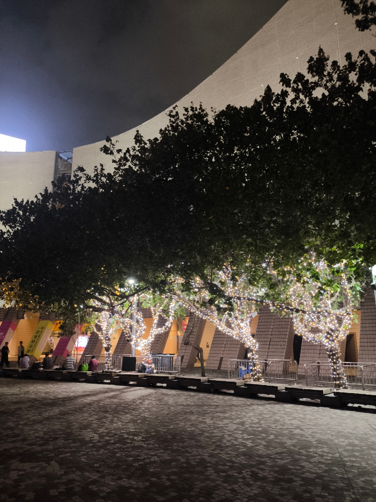 A nighttime photograph captures a public plaza in front of the Hong Kong Cultural Centre in Tsim Sha Tsui, Hong Kong, China. The upper background features the distinctive curved, light-colored, textur…read more