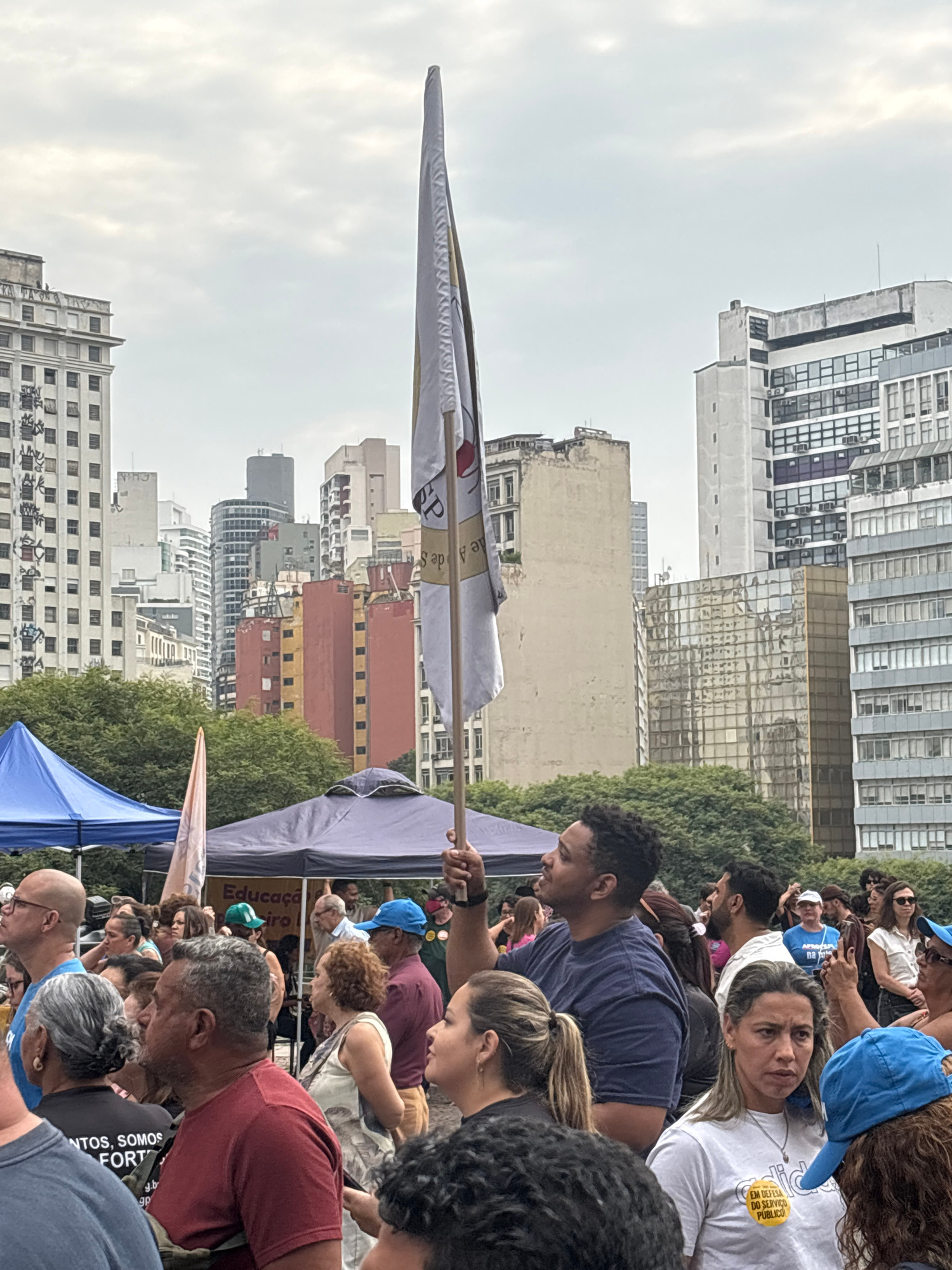 The image shows a crowd of people, some of whom are holding a white flag with the letters "SP" on it, against a backdrop of high-rise buildings. A few tents are visible in the crowd, and the sky is ov…read more