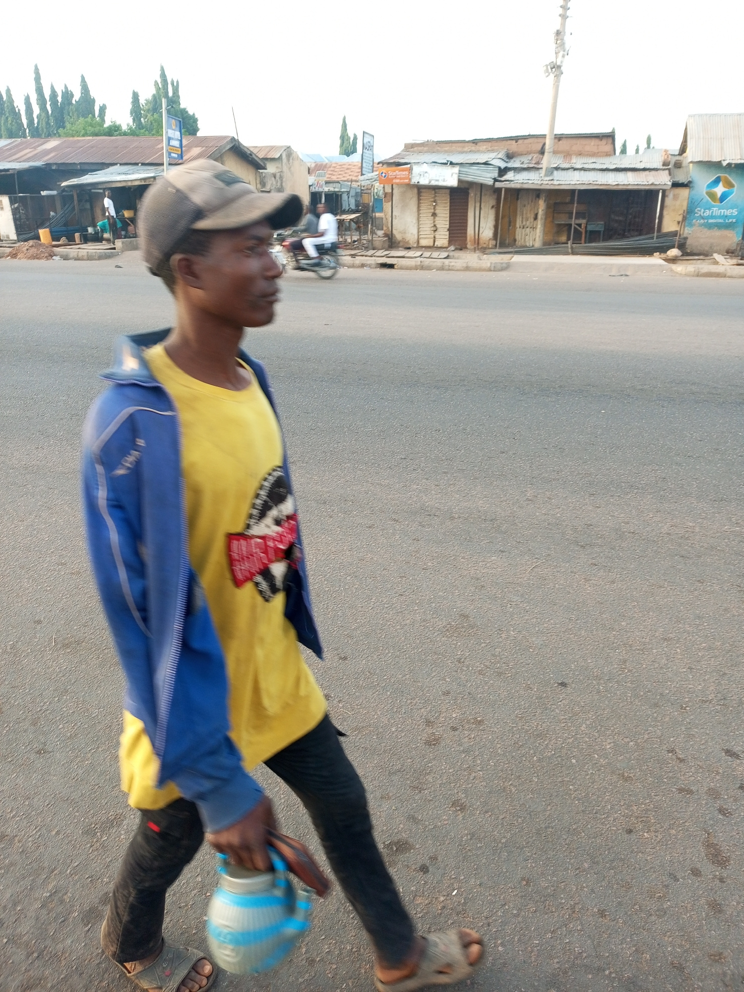 The image shows a dark-skinned man walking on a paved street. He is wearing a grey baseball cap, a yellow t-shirt with a design, a blue jacket, black pants, and sandals. He is carrying a blue and whit…read more