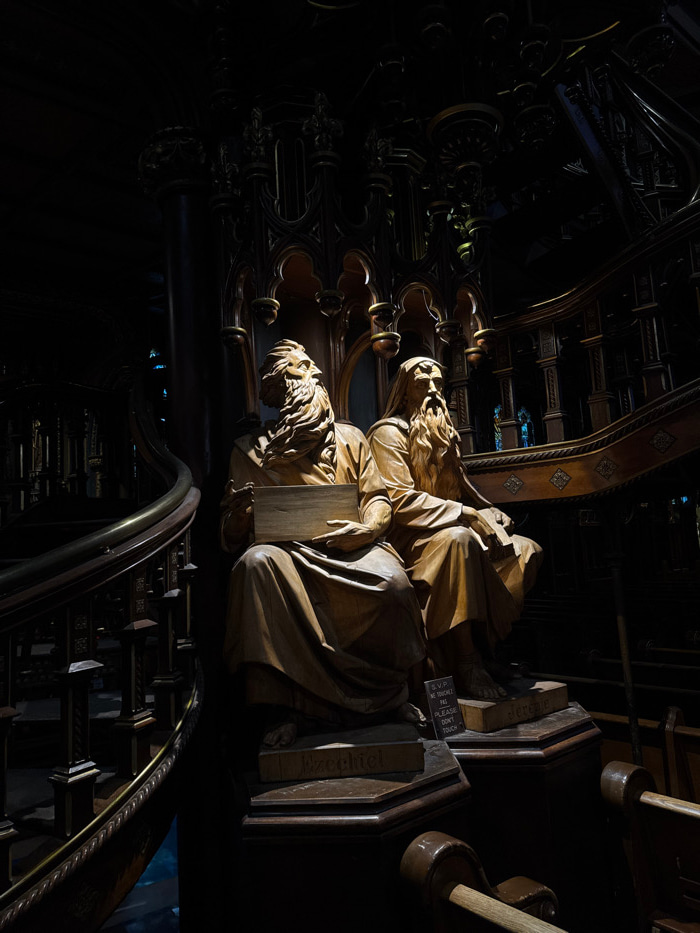 An artistic, low-angle shot reveals a dark, ornately decorated space. The scene is dominated by two light-colored, carved wooden figures in flowing robes, possibly biblical prophets, each holding what…read more