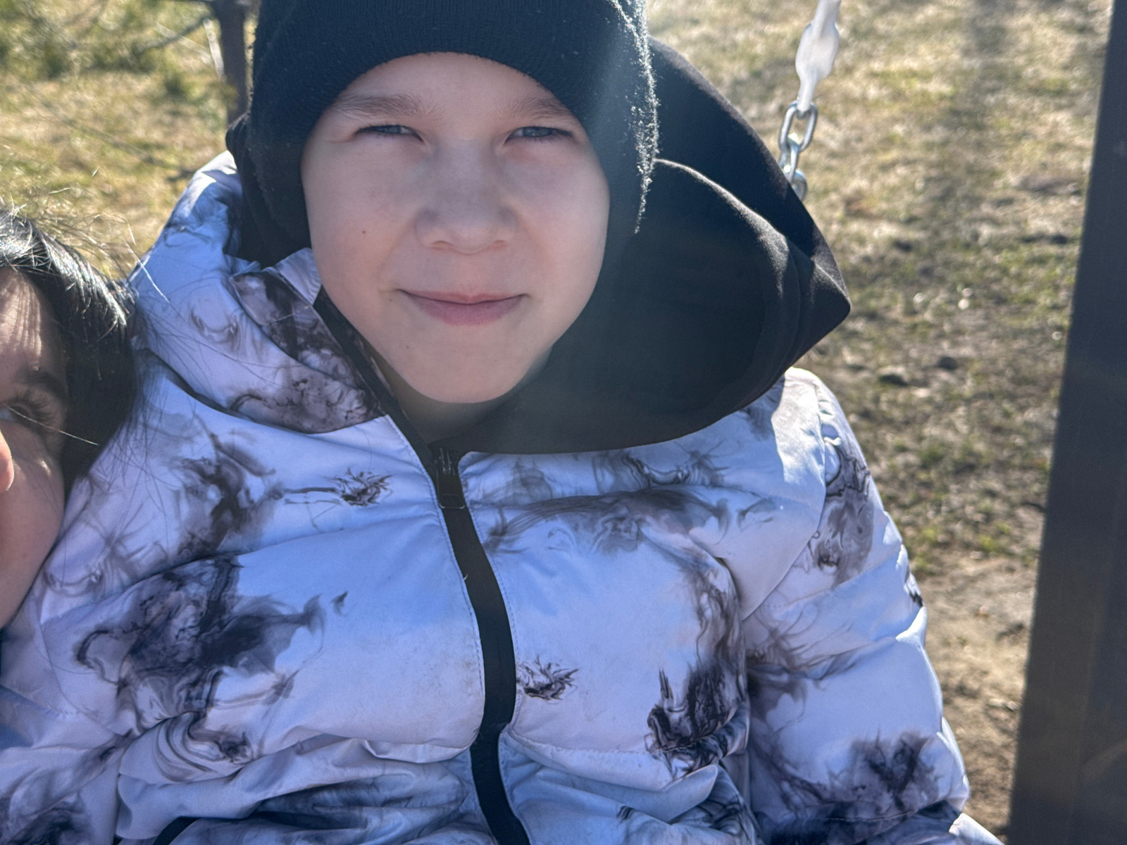 A child wearing a black hat and a white puffy jacket with gray and black patterns is upside down. A swing chain is visible. The location is not specified in the provided data.