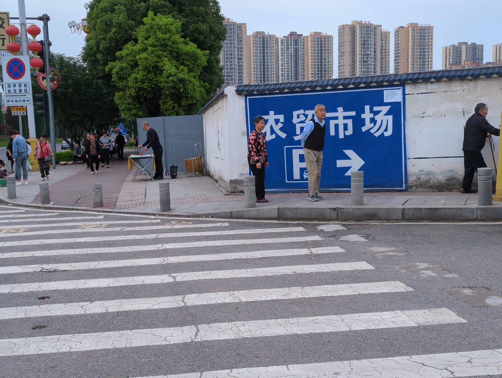 This image captures an urban street scene in Jiangjin, China, likely during the late afternoon or early evening under an overcast sky. In the foreground, a zebra crossing with worn white stripes spans…read more