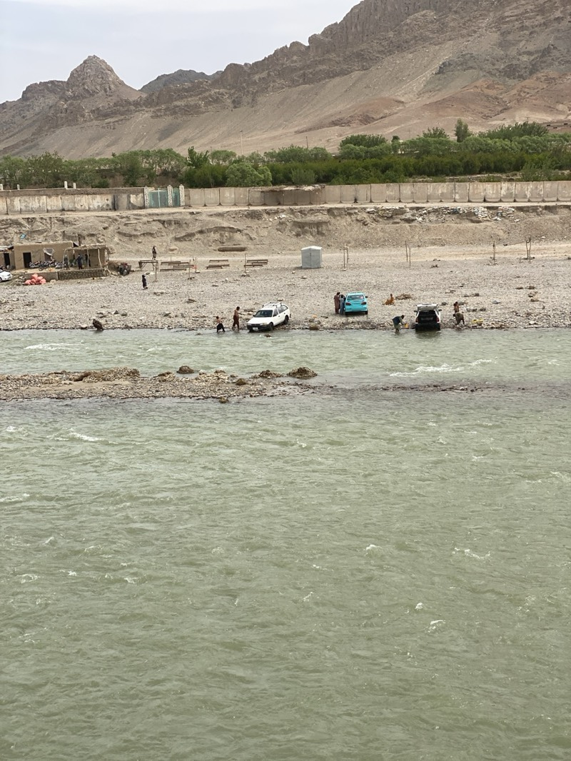 This image, captured in Deh Sabzi, Afghanistan, depicts a functional and natural scene centered around a wide, flowing river. The foreground is dominated by the river, its murky, greenish-brown water…read more