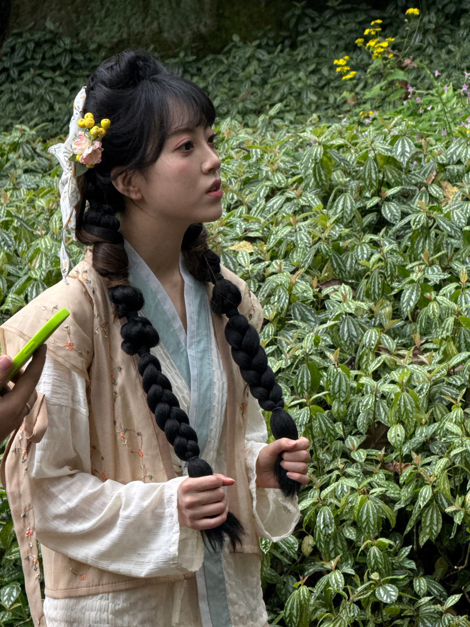 A young woman with long black hair styled into two thick braids lies on a bed of dense green foliage, likely in an outdoor garden setting. She is positioned on her side, facing upwards and towards the…read more